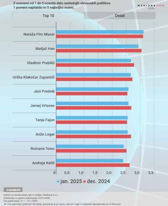 Jani Prednik, ki je v decembrski raziskavi Mediane zasedel deveto mesto, se je v novi raziskavi povzpel za štiri mesta in se tokrat uvrstil na peto mesto. S tem je po priljubljenosti prehitel Jerneja Vrtovca, Tanjo Fajon, Anžeta Logarja, Romano Tomc in Andrejo Katič, ki so se prav tako uvrstili na seznam desetih najbolj priljubljenih politikov po mnenju anketirancev.