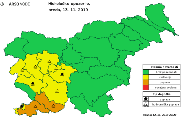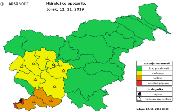 Predvsem v jugozahodni Sloveniji lahko v torek zvečer in v noči na sredo, zaradi lokalnih močnih in dolgotrajnejših nalivov, močneje narastejo hudourniški vodotoki, potoki in manjše reke. Ob tem lahko lokalno prihaja do razlivanj. Porast vodotokov bo ponoči in jutri opažen tudi drugod po državi.