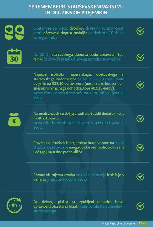 Vlada je na današnji seji sprejela predlog Zakona o spremembah in dopolnitvah Zakona o starševskem varstvu in družinskih prejemkih. S predlogom se podaljšuje materinski, očetovski in starševski dopust, izboljšuje položaj družin, kjer je mati ob rojstvu nezaposlena, ter izboljšuje položaj študentskih družin …