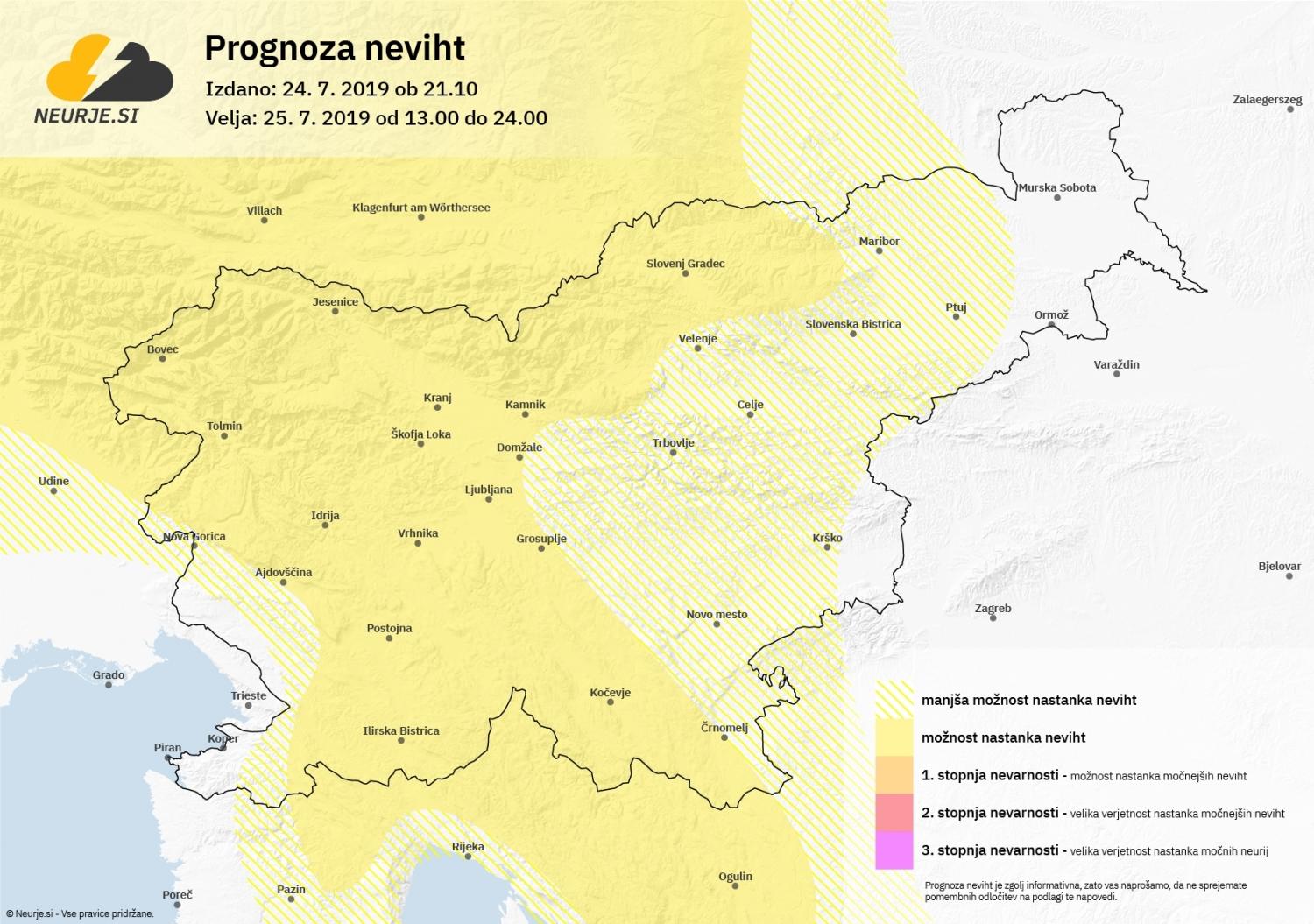 Zaradi šibkih vetrov v celotnem višinskem profilu bo gibanje neviht počasno, nastajale bodo večinoma stacionarne nevihte. Ob razvoju neviht je možen kakšen močnejši in dolgotrajnejši naliv ter manjša toča. Kakšna nevihta je možna tudi zvečer ali v noči na petek, opozarjajo na spletnem portalu Neurje.si.
