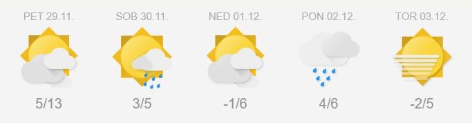 V prihodnjih dneh bomo deležni dveh ohladitev, napovedujejo na spletni strani Neurje.si. Prva prihaja že v soboto. Pred tem bomo še pod vplivom šibkih zahodnih vetrov. V noči na petek lahko ponekod še nastanejo občasne manjše padavine, deloma plohe. Petek bo suh. Do noči na soboto bo prevladovalo spremenljivo oblačno vreme, v petkovem jutranjem in dopoldanskem času bo ponekod tudi megleno. Čez dan bo po državi tudi nekaj sonca. Ponekod se bodo občasno pojavljale manjše padavine, deloma plohe. Jutranje temperature se bodo v petek gibale med 3 in 7, ob morju okrog 11 °C, najvišje dnevne pa bodo med 10 in 15 °C. Najtopleje bo na skrajnem jugovzhodu Slovenije in ob morju.