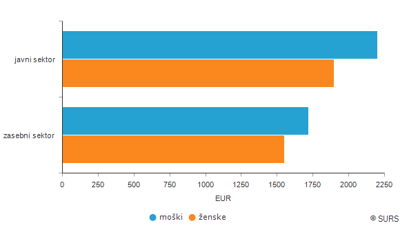 Povprečna mesečna bruto plača moških je bila v letu 2018 višja od povprečne mesečne bruto plače žensk tako v zasebnem kot tudi v javnem sektorju. Ženske so tako v zasebnem sektorju prejele v povprečju 1.549 EUR, v javnem pa 1.900 EUR, kar je 9,8 % (v zasebnem) in 13,7 % (v javnem) manj od moških v omenjenih sektorjih. V letu 2018 se je v primerjavi s preteklim letom zvišala tako povprečna mesečna bruto plača moških (v javnem sektorju za 3,7 %, v zasebnem za 4,1 %) kot povprečna mesečna bruto plača žensk (za 2,4 % v javnem in za 3,5 % v zasebnem sektorju.