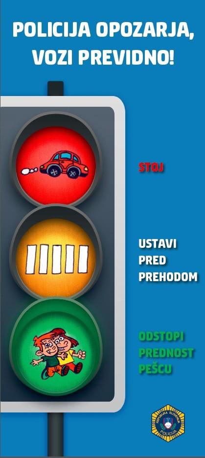 - Cesto lahko prečkajo samo na prehodu za pešce in pri zeleni luči na semaforju za pešce v primeru semaforiziranih prehodov.
