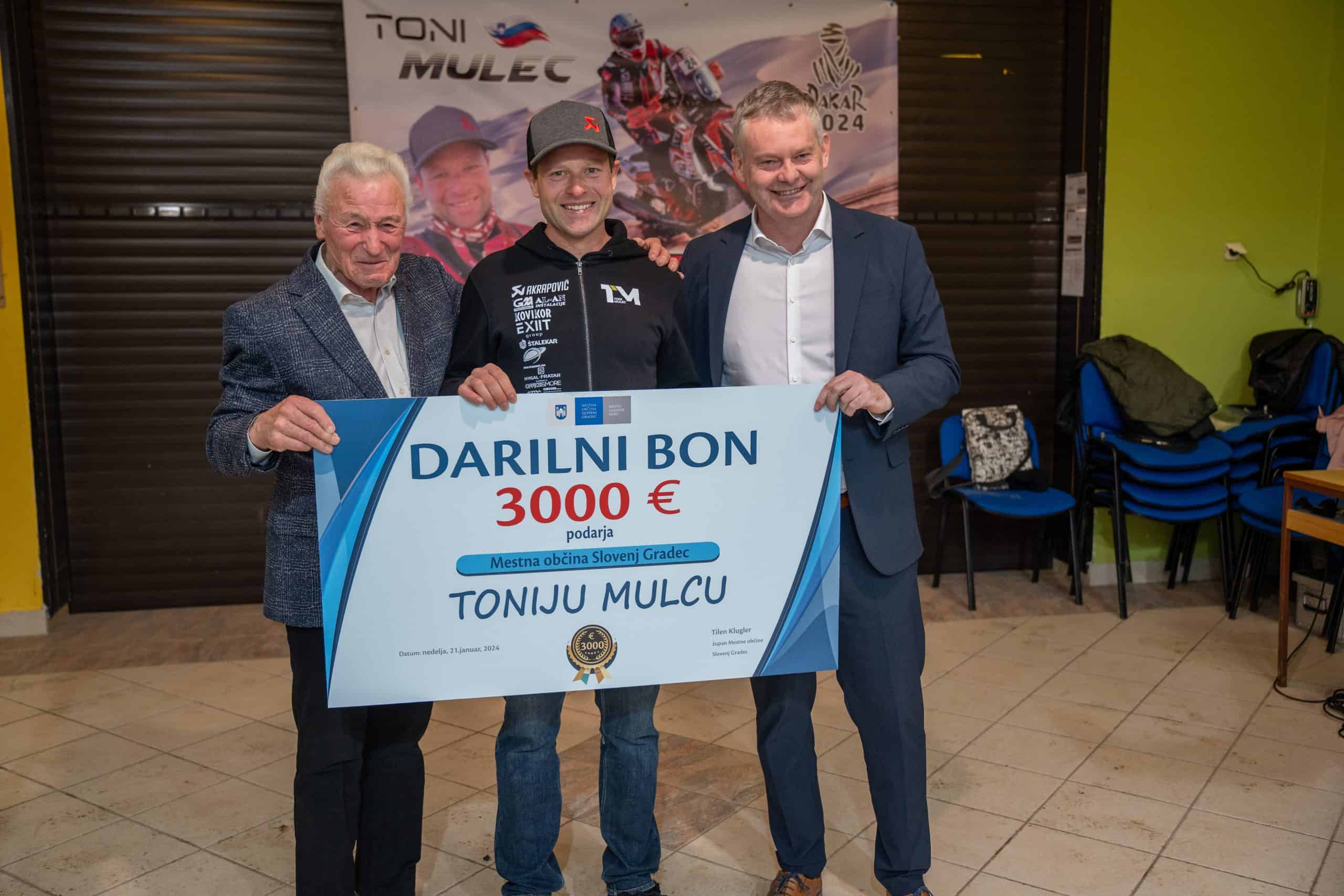 Čestitkam se je pridružil tudi župan Mestne občine Slovenj Gradec, Tilen Klugler, ki je skupaj s predsednikom VS Legen, Edvardom Turičnikom, Toniju predal darilni bon v višini 3.000 €. Predsednica Športne zveze Slovenj Gradec, mag. Mojca Vrhovnik, pa je Toniju poklonila darilo za rehabilitacijo po napornem tekmovanju.