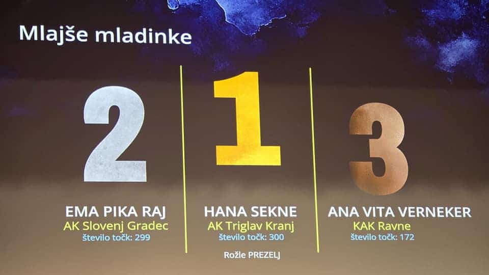 Ema Pika Raj je prejela priznanje Atletske zveze Slovenije v kategoriji mlajših mladink. Od najboljše jo je ločila le ena točka. Maja Pogorevc je prejela priznanje za 15 nastopov za reprezentanco Slovenije.