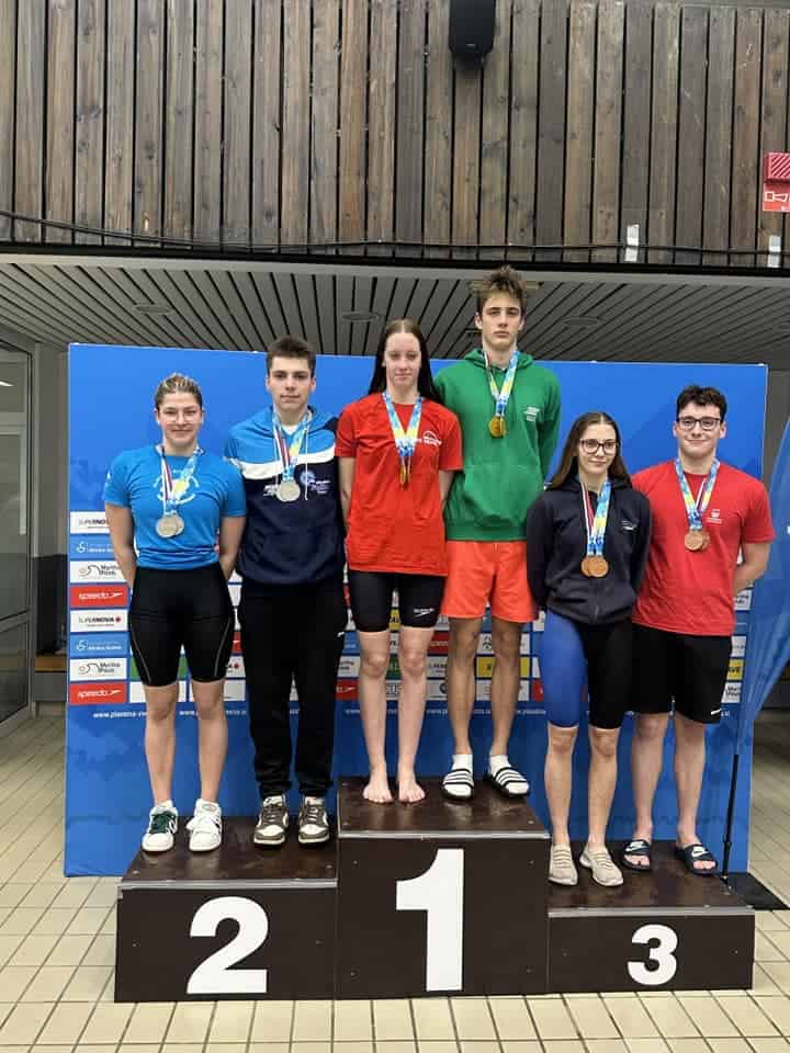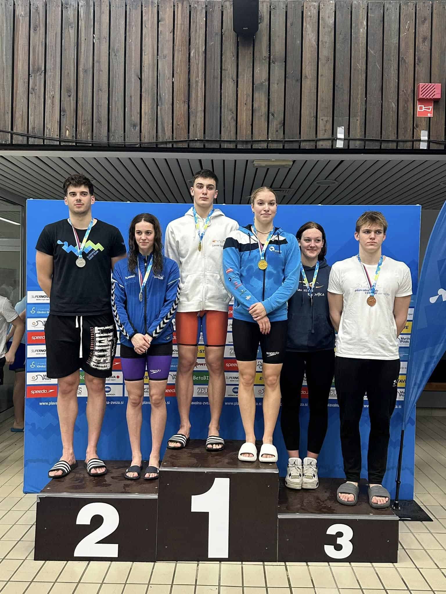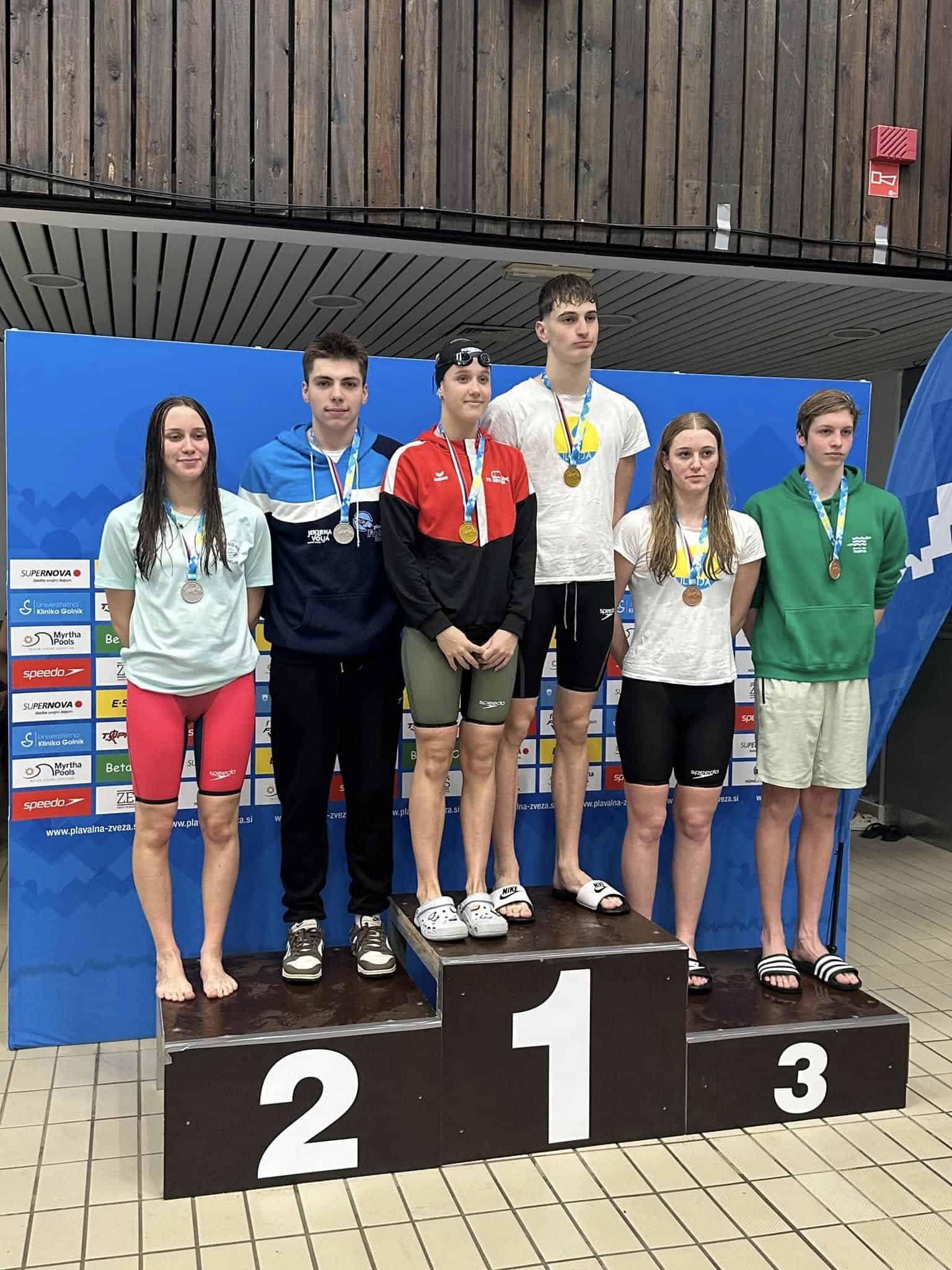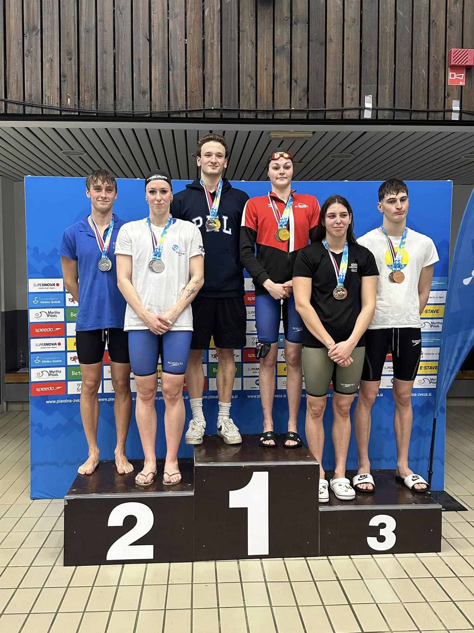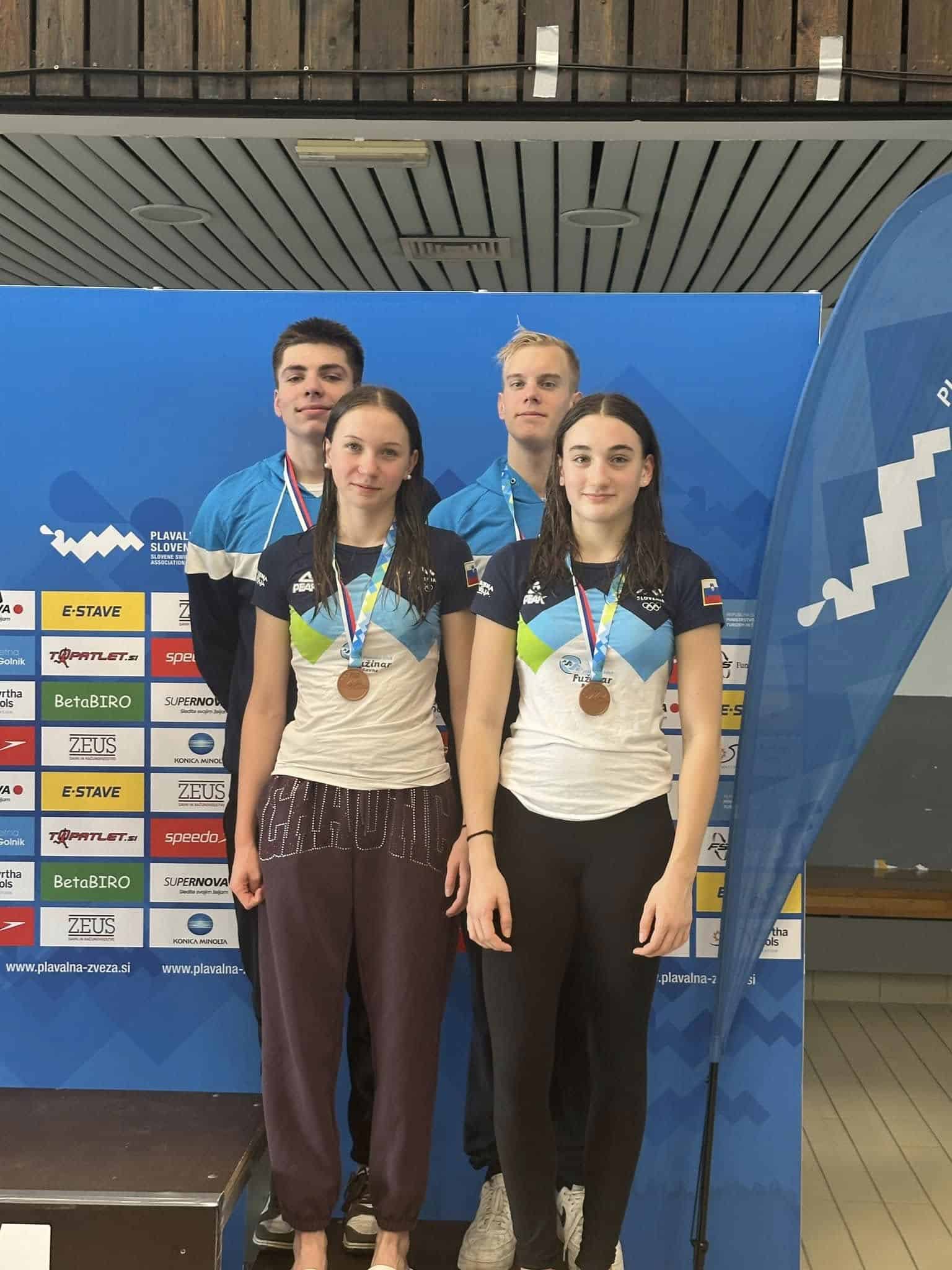 Že dopoldne je kadetska mešana štafeta 4x100 mešano v postavi Aleksandra Gnamuš Šlebnik, Zara Knez, Žan Luka Vušnik in Nik Markač osvojila tretje mesto.