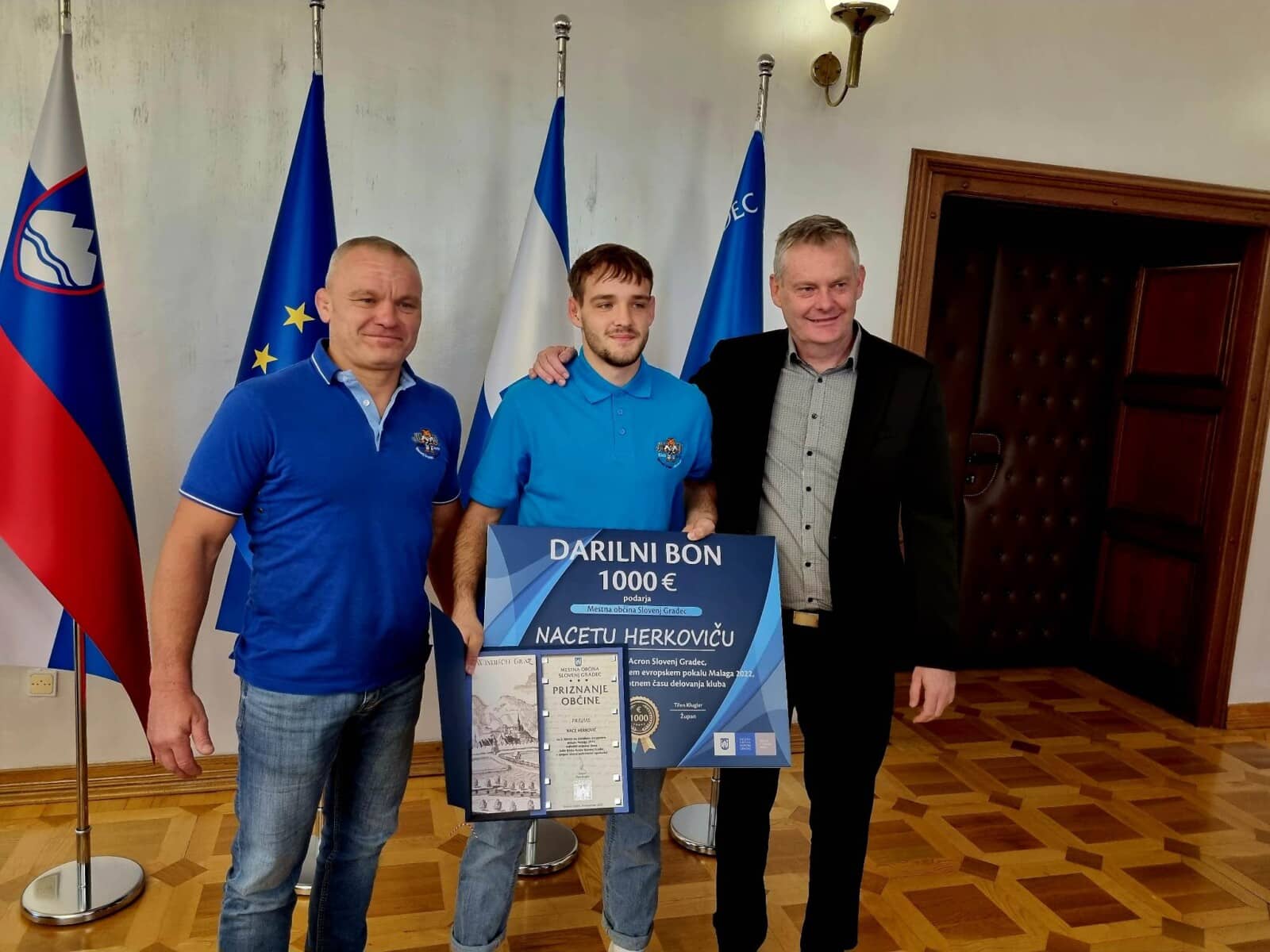 Ob tej priložnosti je župan Mestne občine Slovenj Gradec Tilen Klugler uspešnemu mlademu športniku predal tudi denarno nagrado za odličen dosežek. Sprejema, na katerem je Mestna občina Slovenj Gradec Naceta Herkoviča nagradila s tisoč evri, pa se je udeležil tudi predsednik Judo kluba Acron Slovenj Gradec Ruslan Yankovsky.