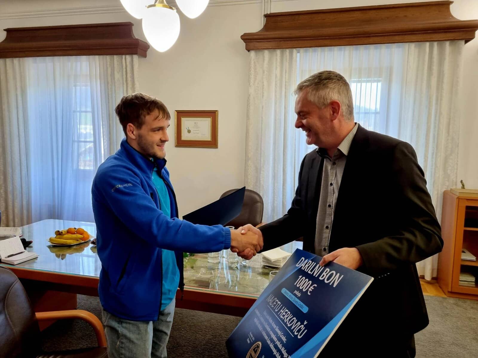 Klugler je perspektivnemu športniku čestital za vse uspehe, se mu zahvalil za promocijo in vse, kar je v tem času storil za Slovenj Gradec, da je še bolj prepoznaven v svetu ter mu zaželel uspešno športno pot tudi v prihodnje.