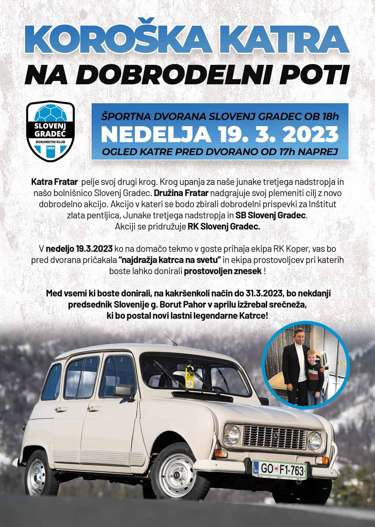 Med vsemi ki boste donirali, na kakršenkoli način do 31.3.2023, bo nekdanji predsednik Slovenije g. Borut Pahor v aprilu izžrebal srečneža, ki bo postal novi lastni legendarne Katrce.