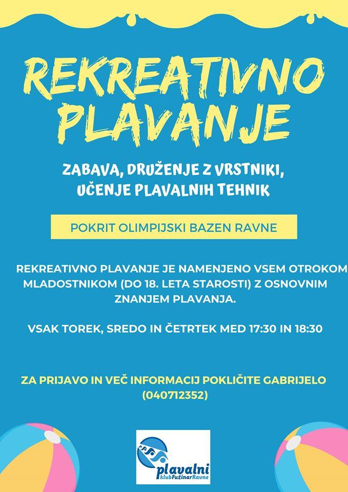 Rekreativno plavanje je namenjeno vsem otrokom, mladostnikom do 18. leta starosti z osnovnim znanjem plavanja. Z vadbo pričnejo v torek, 7. januarja.