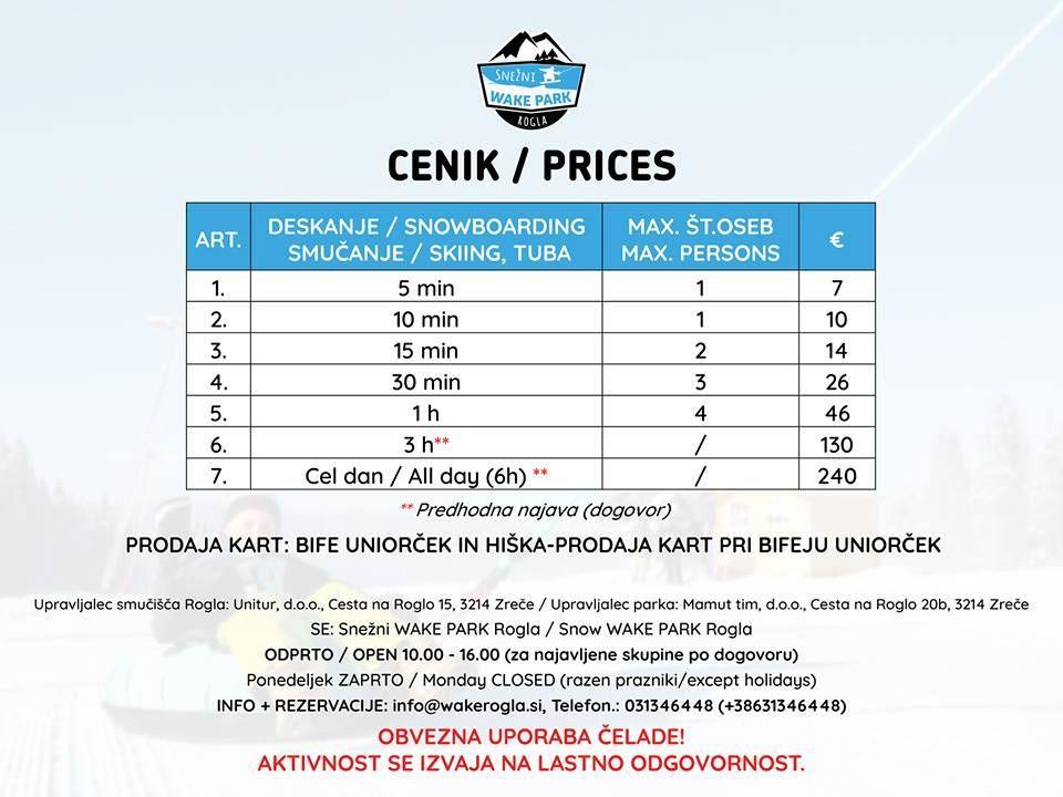 Prvi wake park v Sloveniji se nahaja na smučišču Rogla, na ravnini med smučarsko progo Košuta in bifejem Uniorček. Vse kar potrebujete za adrenalinsko doživetje je snowboard, smuči, tuba in čelada. Vso opremo za uživanje na snegu, ki je namenjeno vsej družini, vključno z najmlajšimi, pa si lahko na Rogli tudi izposodite.