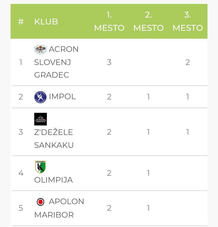 Po številu osvojenih medalj v obeh starostnih kategorijah je Judo klub Acron Slovenj Gradec osvojil odlično 1. mesto.