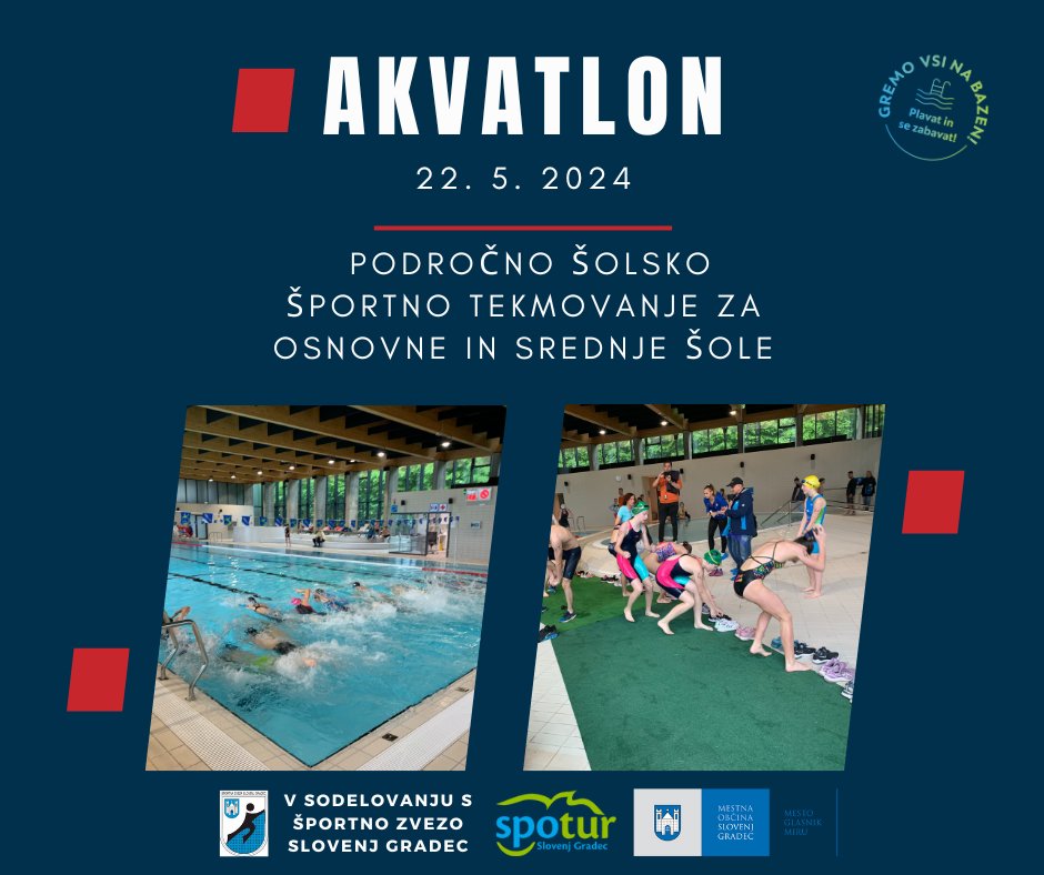 Na bazenskem kompleksu Aqualatio bo jutri potekal Akvatlon, področno šolsko športno tekmovanje, na katerem bodo sodelovali učenci in dijaki osnovnih in srednjih šol.