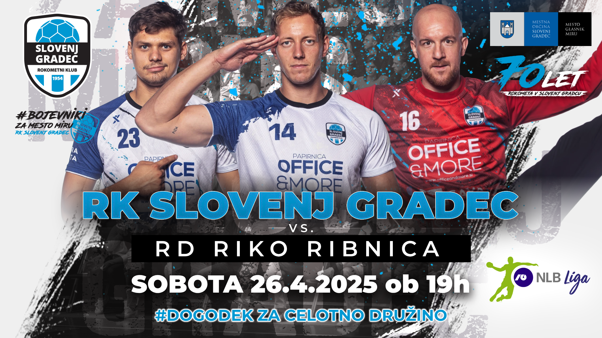 Rokometaši RK Slovenj Gradec se bodo danes, 26. aprila, ob 19. uri v športni dvorani Slovenj Gradec pomerili z RD Riko Ribnica.
