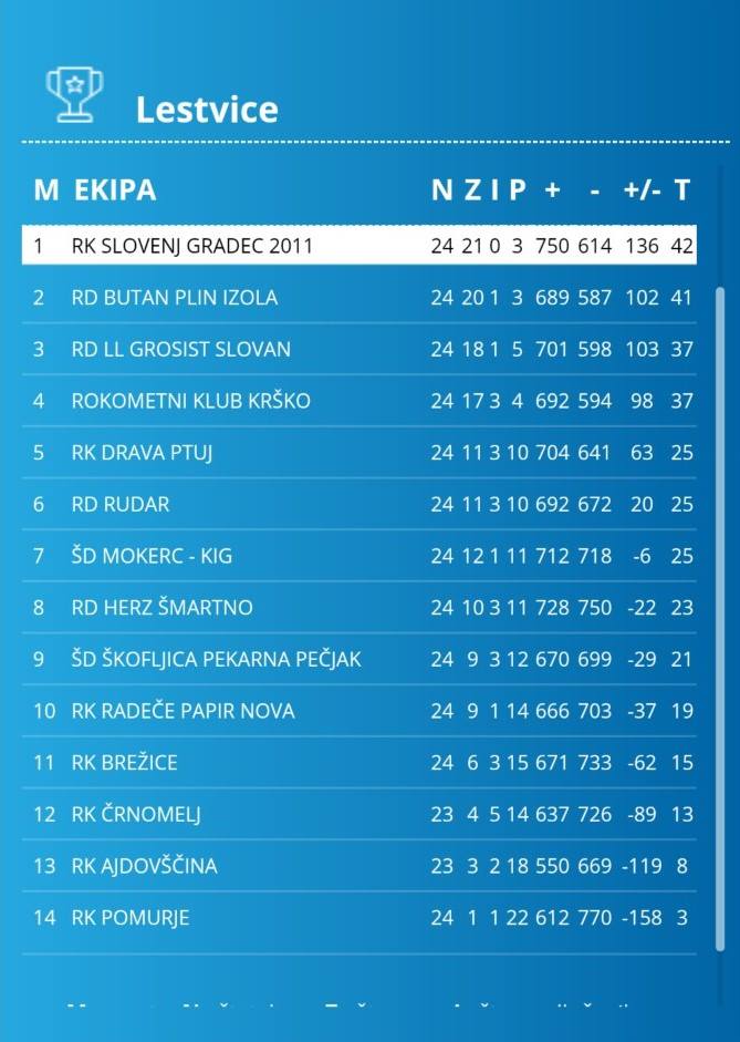 Pred današnjo tekmo so bili v vodstvu Slovenjgradčani s 40 točkami, Izola je bila druga z 39 točkami, Slovan in Krško pa četrta s po 37 točkami. Po zmagi nad Krčani pa ostajajo na prvem mestu Slovenjgradčani z 42 točkami.