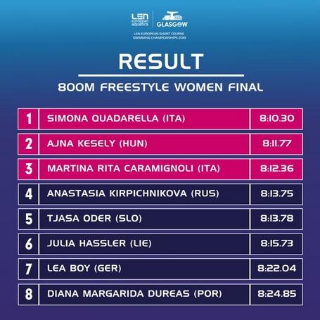 Zlato medaljo si je na koncu z zanesljivo zmago priplavala Italijanka Simona Quadarella, ki je uspela uspešno odgovoriti na napad srebrne Madžarke Ajne Kesely. Tjašo zdaj v Glasgowu čaka še nastop v disciplini 400 m prosto, kjer si v prvi vrsti želi postaviti nov osebni rekord.