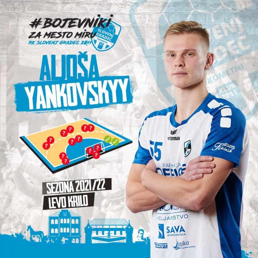 Kot drugega bojevnika, ki bo v prihodnji sezoni branil barve slovenjgraškega kluba, predstavljajo mladega Aljošo Yankovskyya. Aljoša velja za zelo delavnega in discipliniranega mladega rokometaša, ki v drugem delu prvenstva zaradi poškodbe Jaroša Buloviča odlično opravlja svoje delo na levem krilu. Izhaja iz športne družine in ve, kakšno odgovornost in čast pomeni zastopati grb mesta miru med prvoligaško druščino najboljših slovenskih rokometnih klubov.