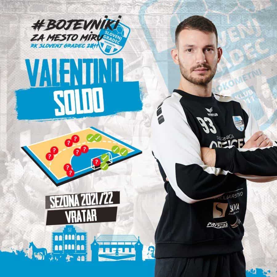 Po Gašperju Dobaju so za prihodnjo sezono sodelovanje podaljšali z otrokom kluba Valentinom Soldom. V letošnji sezoni je tvoril odličen tandem z nekaj let mlajšim Dobajem. Valentino kljub svojim osemindvajsetim letom velja za enega izkušenejših igralcev med bojevniki. S svojo motivacijo in pozitivno energijo vseskozi spodbuja in podpira svojo ekipo, kar bo lahko sedaj počel tudi v prihodnji sezoni. Sigurno pa je lahko Soldo vzor vsem mladim vratarjem belo modre družine, ki se pridno prebijajo skozi mlajše selekcije.
