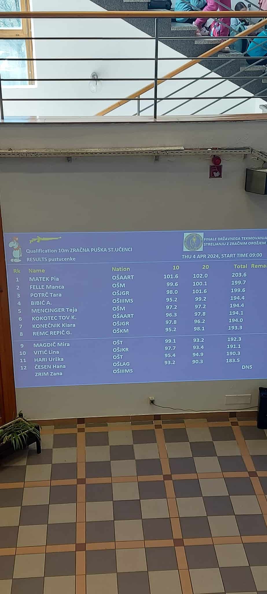V kategoriji starejših deklic z zračno puško je Manca Felle dosegla izjemen uspeh z visokim drugim mestom, postala je šolska državna podprvakinja. Teja Mencinger pa je prav tako dosegla lep dosežek s petim mestom med posameznicami v isti kategoriji, sestavila je dve zelo solidni seriji.