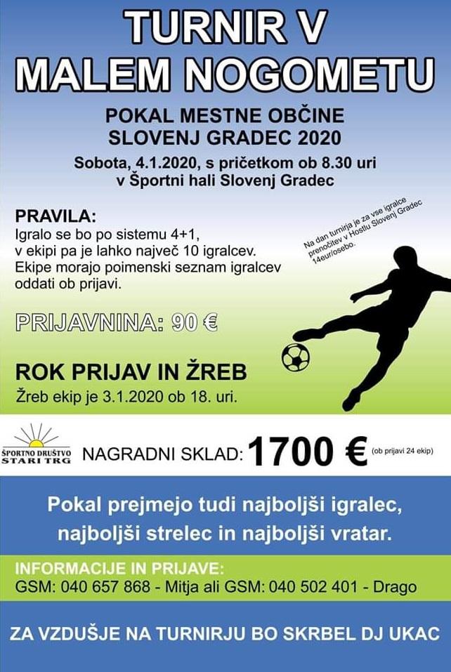 Jutri, v soboto, 4. 1. 2020, se ob 8. uri v športni dvorani Slovenj Gradec pričenja 6. tradicionalni turnir v malem nogometu za pokal mestne občine Slovenj Gradec.