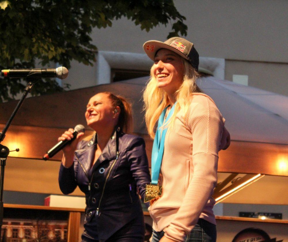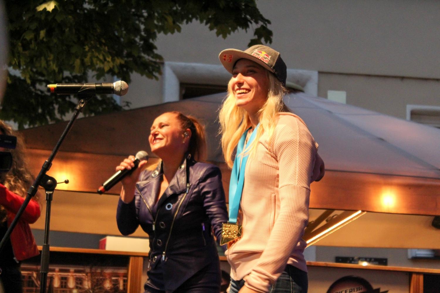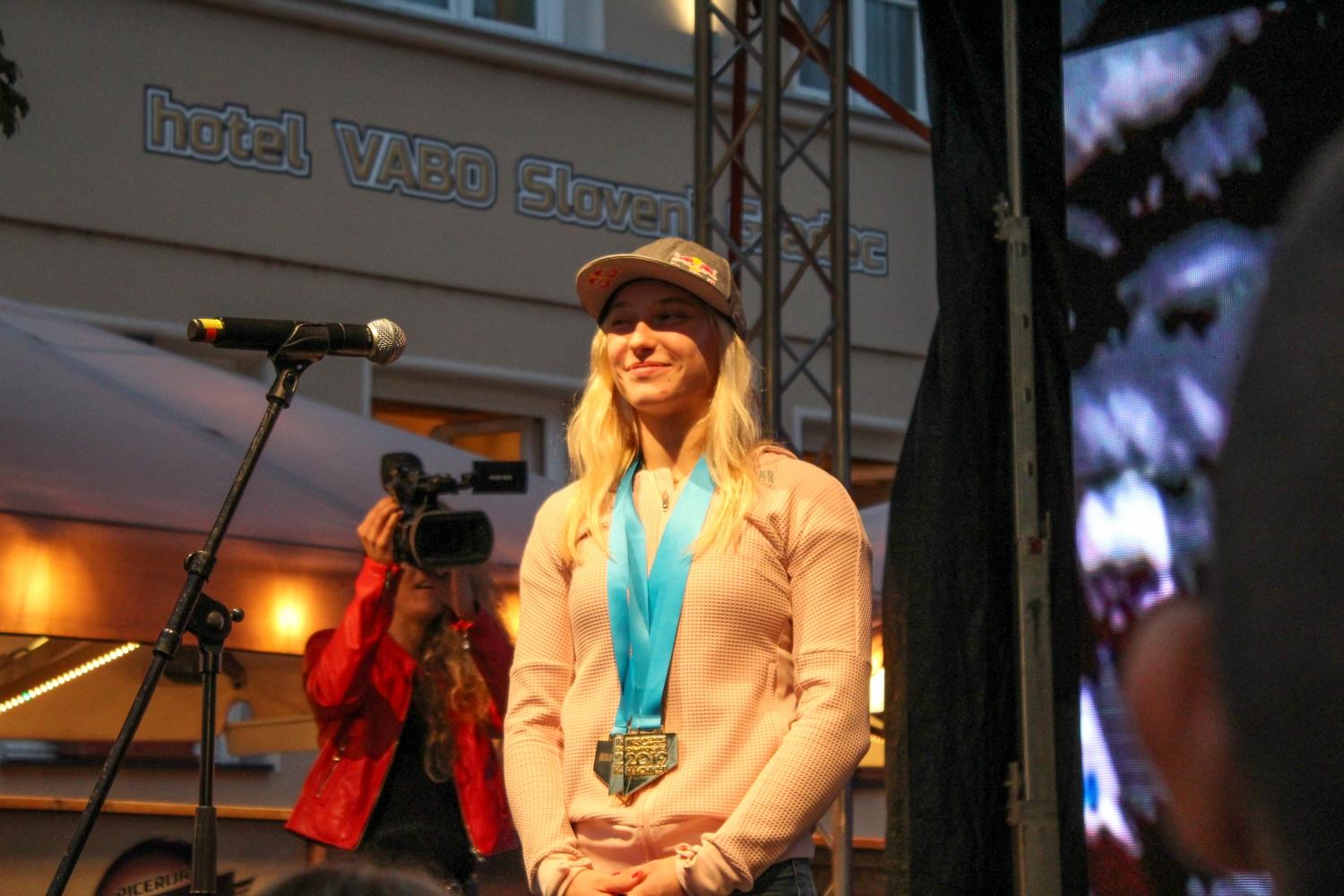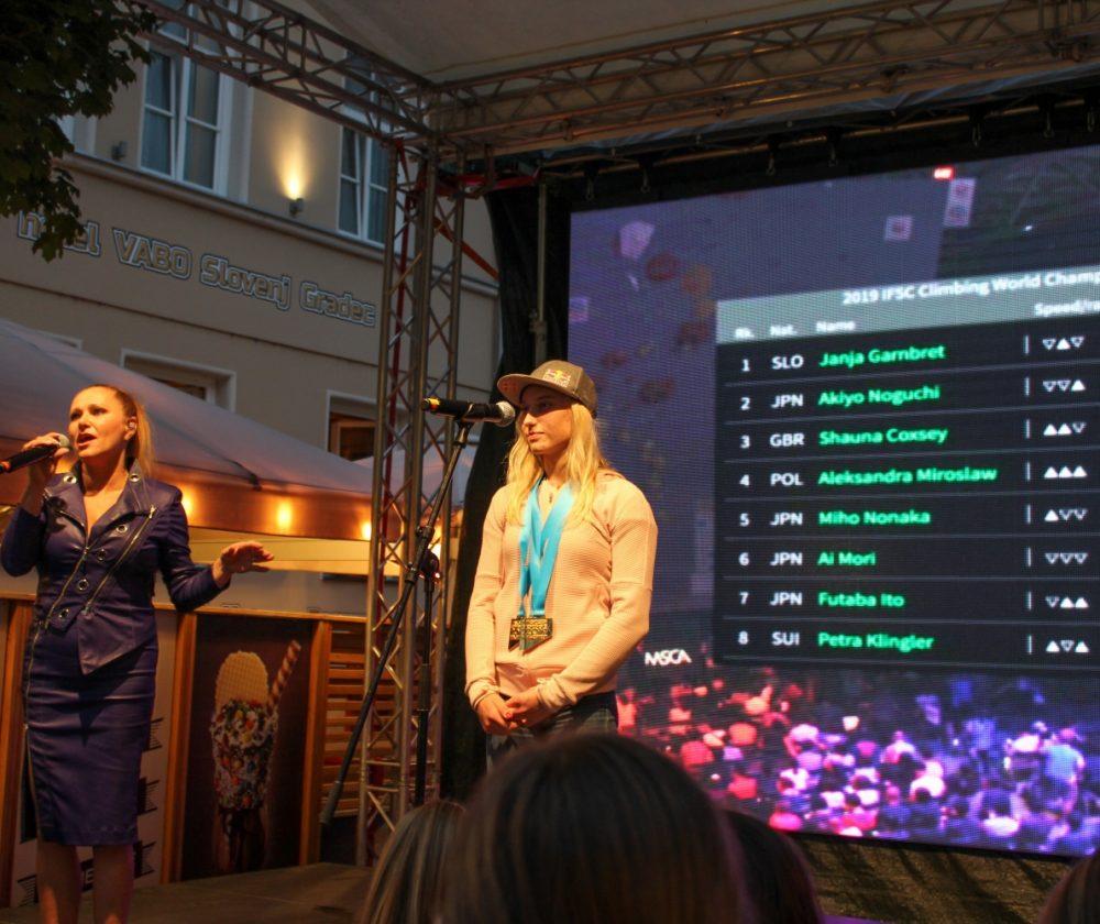 V počastitev izjemnega uspeha, trojne zmage na svetovnem prvenstvu v kombinaciji, balvanih in težavnosti ter zgodovinskega dosežka Slovenjgradčanke Janje Garnbret so se včeraj na Glavnem trgu v Slovenj Gradcu veselili številni njeni podporniki in navijači od blizu in daleč.