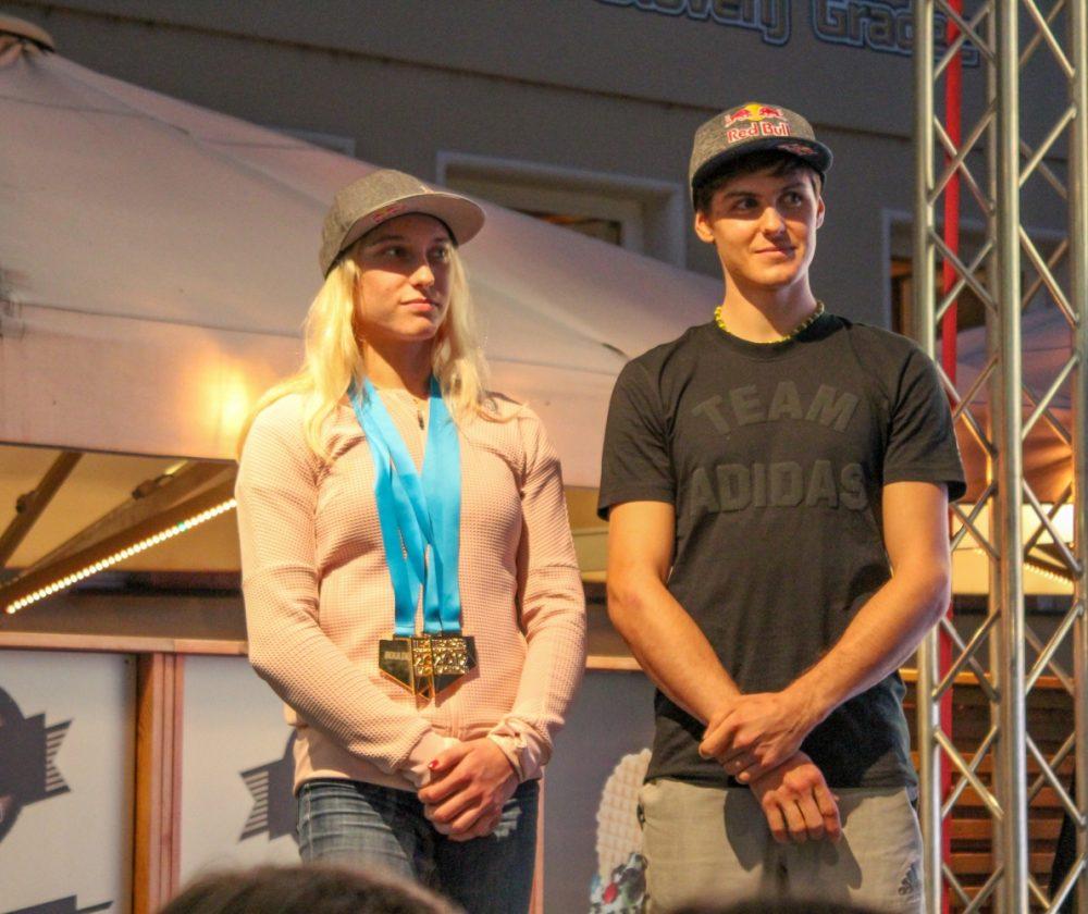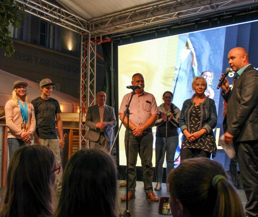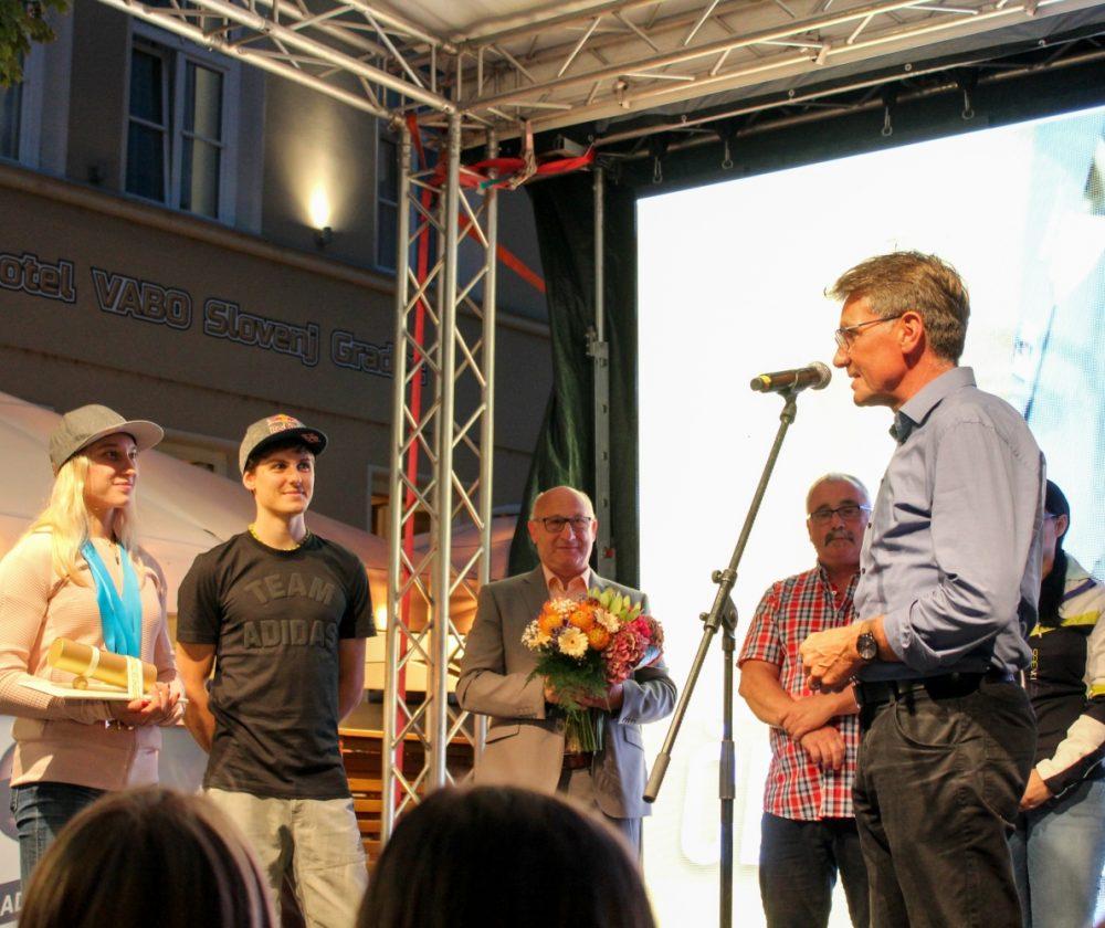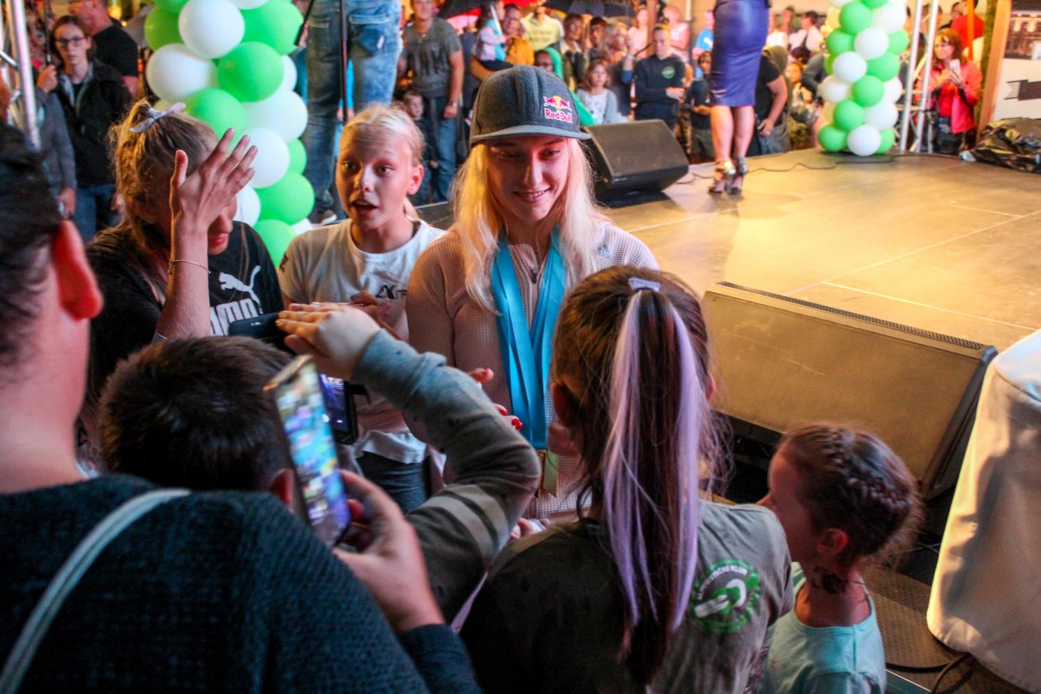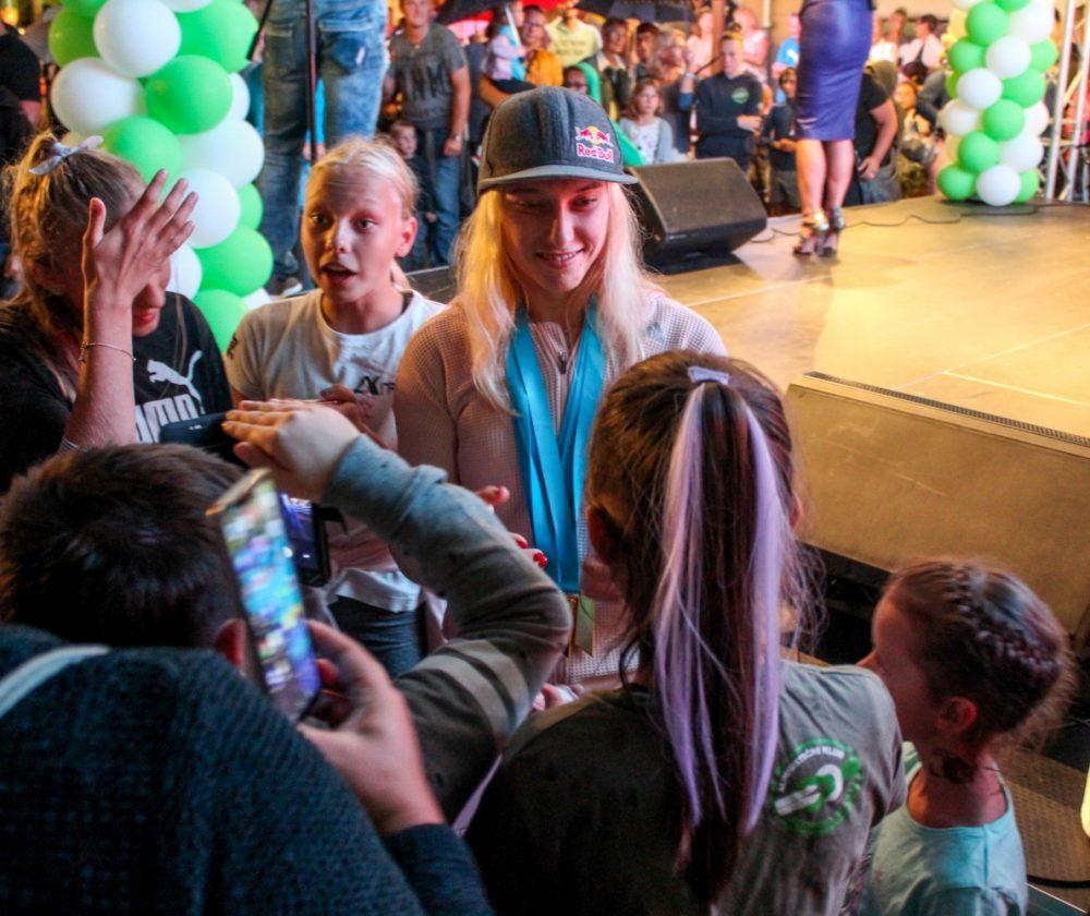 V počastitev izjemnega uspeha, trojne zmage na svetovnem prvenstvu v kombinaciji, balvanih in težavnosti ter zgodovinskega dosežka Slovenjgradčanke Janje Garnbret so se včeraj na Glavnem trgu v Slovenj Gradcu veselili številni njeni podporniki in navijači od blizu in daleč.