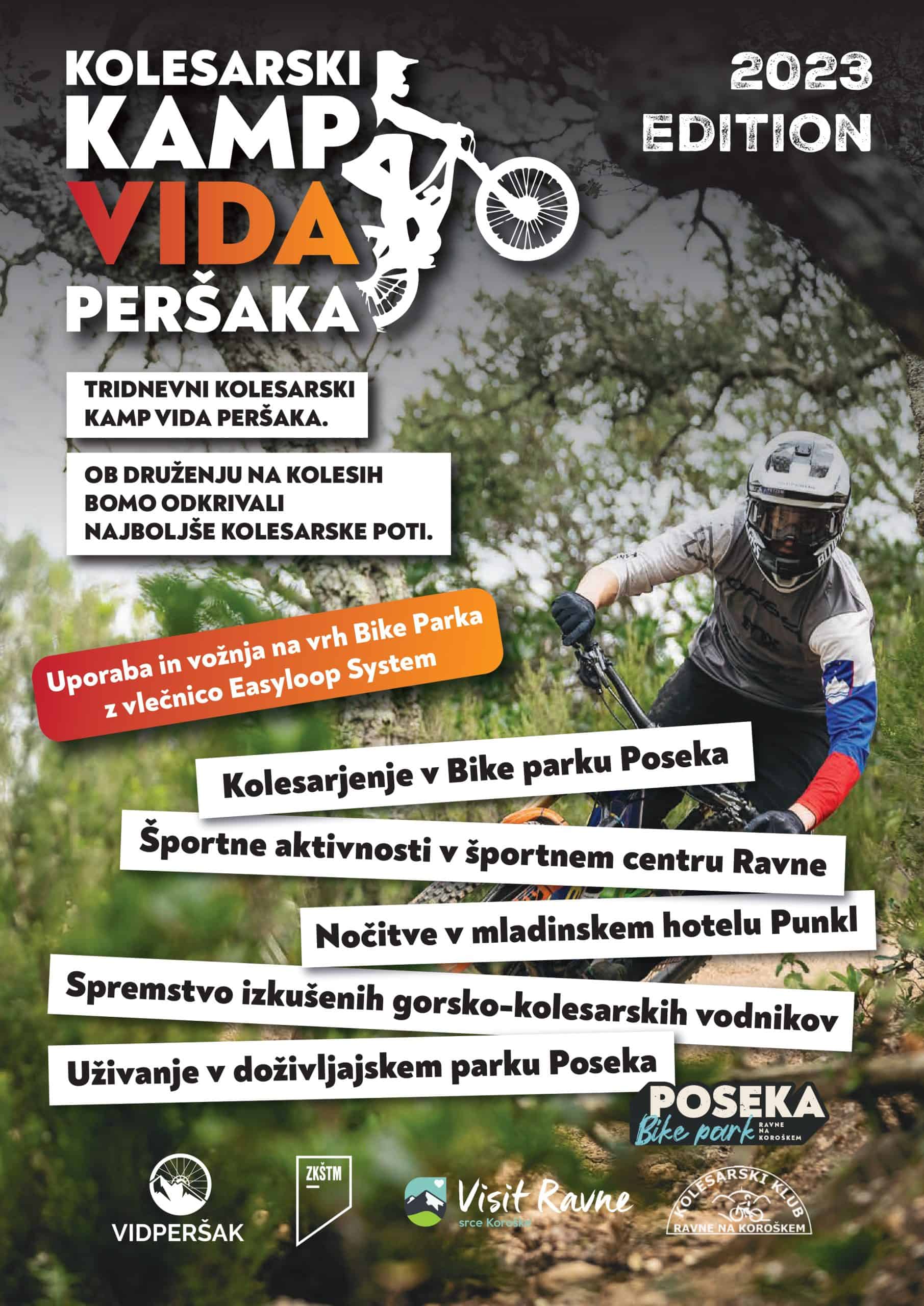 Nameščeni boste v športnem centru Ravne v mladinskem hotelu Punkl, prvem slovenskem mladinskem hotelu, ki je zasnovan v skladu z naravnimi in bioklimatskimi danostmi okolice kot arhitekturno samosvoja nizkoenergijska lesena gradnja. Kolesarske dogodivščine se lahko pričnejo. Vse dni se boste gibali v Geoparku Karavanke, ki je pod Unescovim okriljem in je prvi geopark v Sloveniji in prvi čezmejni geopark (v Sloveniji in Avstriji). V treh dneh boste dodobra spoznali mogočne koroške gozdove, uživali v lepih razgledih ter nenazadnje tudi dobri kolesarski družbi. Spoznali in naučili se boste gorsko-kolesarskih prvin pod strokovnim vodstvom izkušenih vodnikov in animatorjev. Na vas nestrpno čakajo nepozabni kolesarski izleti. Nekatere ture bomo popestrili tudi s peš vzponi na bližnje vrhove oz. oglede naravnih znamenitosti. Vabljeni!