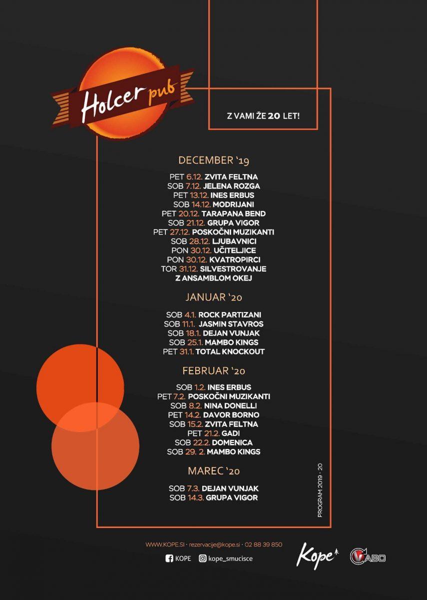 S pestrim programom v Holcer pubu pričenjajo prvi vikend v decembru z velikim ski openingom, ko bodo nastopili člani skupine Zvita feltna in Jelena Rozga. V decembru vas bodo nato zabavali še Ines Erbus, Modrijani, Grupa Vigor, Poskočni muzikanti, Učiteljice in še mnogi drugi. Pripravljajo tudi veliko silvestrovanje z ansamblom Okej, še pred tem pa posebno silvestrsko večerjo, kjer bodo lahko gostje uživali ob kulinariki, ki jo ponujajo. Po novem letu pa bodo poleg pestrega programa nastopajočih (Rock Partizani, Jasmin Stavros, Dejan Vunjak, Mambo Kings) pripravili poseben večer za ženske, saj na Kope prihajajo slači fantje z vrhunskim šovom Total Knockout. Tudi februarja bo zanimivo, saj bodo nastopili Gadi, Domenica, Nina Donelli... za Valentinovo pa vas bo grel Davor Borno. Marca bo nastopil Dejan Vunjak ter Grupa Vigor. Celoten seznam nastopajočih si lahko ogledate v nadaljevanju.
