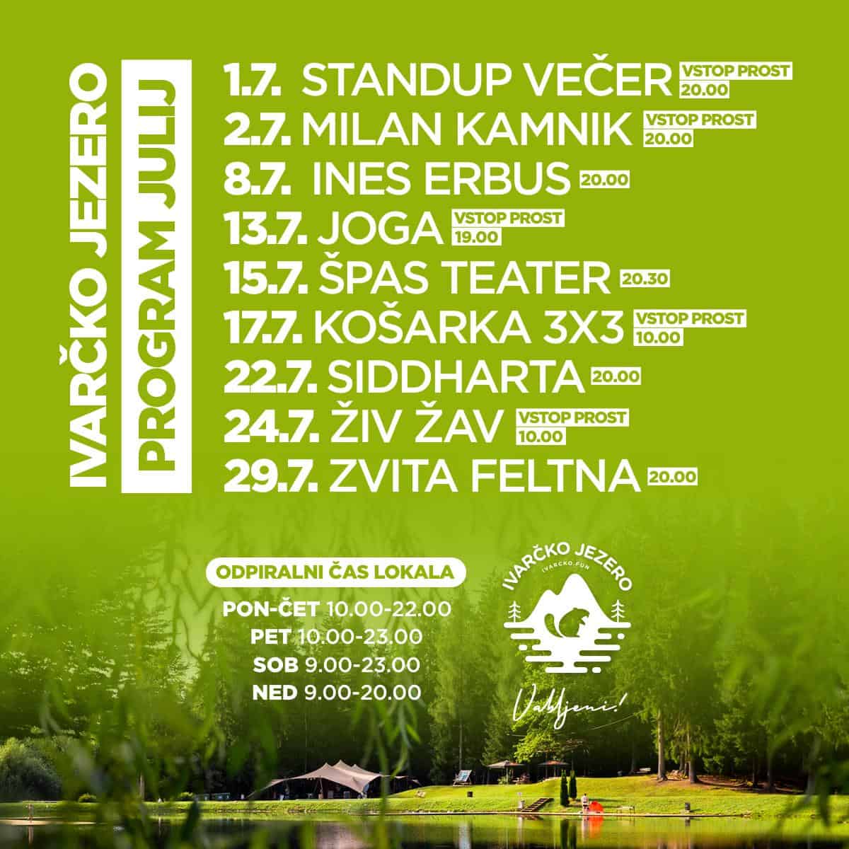 Tudi v mesecu juliju se na Ivarčkem jezeru obeta pestro poletno dogajanje. V petek, 1. julija, vabljeni na Standup večer, ko se boste lahko do solz nasmejali številnim komikom. Za smeh bodo poskrbeli: Andrej Težak Tešky, Maja Monrue, Alen Borišek, Tilen Lavrič, Eldar Omerčič, Ervin Šišič in Aljaž Poredoš