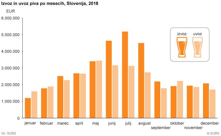 Slovenija je po podatkih Statističnega urada RS v letu 2018 več piva izvozila kot uvozila. Izvozila ga je za 34,1 milijona evrov, uvozila pa za 28,5 milijona evrov. Izvoz piva se je glede na leto 2017 za skoraj 20 % povečal, uvoz pa za 3 % zmanjšal. Izvozila ga je največ v Hrvaško (30 %), Italijo (21 %) ter Bosno in Hercegovino (19 %), uvozila pa iz Avstrije (40 %), Hrvaške (19 %) in Češke (10 %).