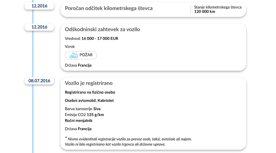 Preglejte tudi registracijsko zgodovino vozila, vključno z državami in datumi registracij. Gre za dragocene informacije, ki med drugim pomagajo preveriti, ali vozilo ni bilo uporabljeno kot taksi ali ali je prihajalo iz leasinga.