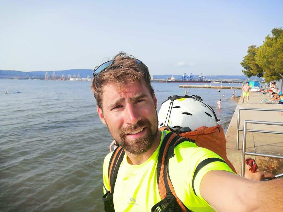 Njegova pot pa se, kot je omenil, ni zaključila na najvišjem slovenskem vrhu, ampak jo je sklenil v ponedeljek v Ankaranu. S Triglava se je namreč v nedeljo s padalom spustil do Bohinja, v ponedeljek pa je pot nadaljeval proti slovenski obali, saj se je želel osvežiti tudi v morju. Kot je povedal, pa mu vreme ni bilo več naklonjeno, razmere so bile namreč po njegovih besedah ekstremno zahtevne. "Od tega, da me je opeklo sonce, do naliva, ki me je ujel med potjo. Zato sem bil primoran pristati na Kozini, od koder pa sem se na avtoštop odpravil do obale in si tako nekako kljub vsemu izpolnil željo, da se vržem v morje."