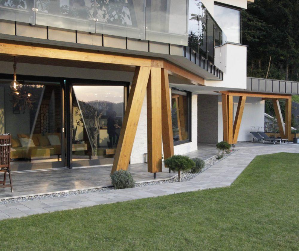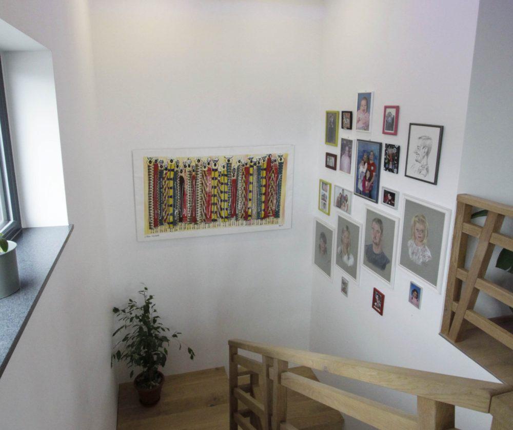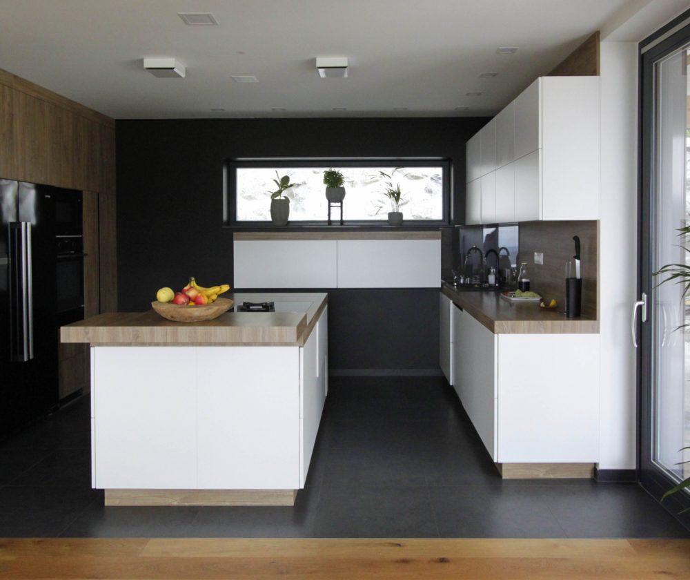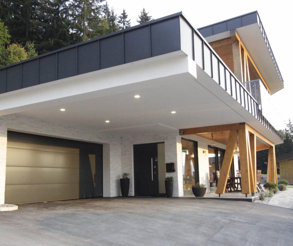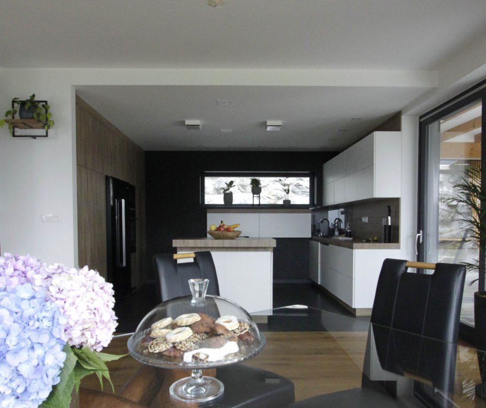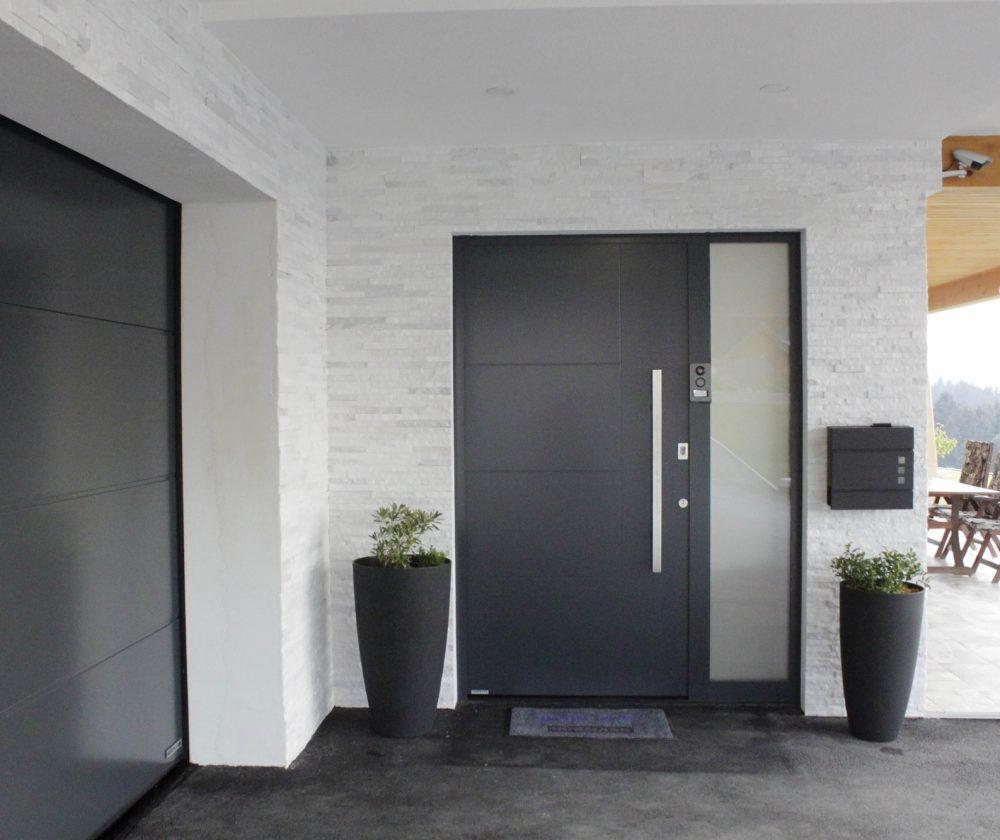 Čeprav je silno razgibana, hiša v Mislinji dosega pasivni razred energetske učinkovitosti. K temu pripomore tudi visokokakovostno stavbno pohištvo, ki ga opazimo že na daleč. Najprej nas pozdravi veličastni vhod, ki nadkrit s podaljšanim napuščem. Visoko izolativna aluminijasta vhodna vrata, ki sta jih lastnika podobno kot tudi garažna vrata izbrala pri podjetju Hörmann Slovenija, nudijo maksimalno varnost in udobje stanovalcem. Vgrajeno imajo večtočkovno zaklepanje, odklepajo pa se pomočjo prstnega odtisa. Za prijazen in svetel sprejem v predsobi poskrbi obsvetloba. So pa vhodna vrata barvno in stilno usklajena še z vrati na pomožnem objektu in garaži.
