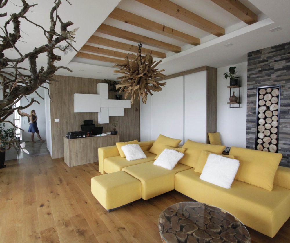 V spodnjem delu hiše iz velikega in svetlega predprostora vstopimo v bivalno-jedilni prostor, ki je fluidno povezan s kuhinjo. Osrednji del interjerja zaseda modularni kavč, ki žari kakor sonce in skladno dopolnjuje prostor, v katerem ima glavno besedo les. Ta se bohoti na tleh, lepota lesa je ujeta tudi v klubski mizici, jedilni mizi in unikatnem visečem svetilu, ki zapolnjuje tretjo dimenzijo.