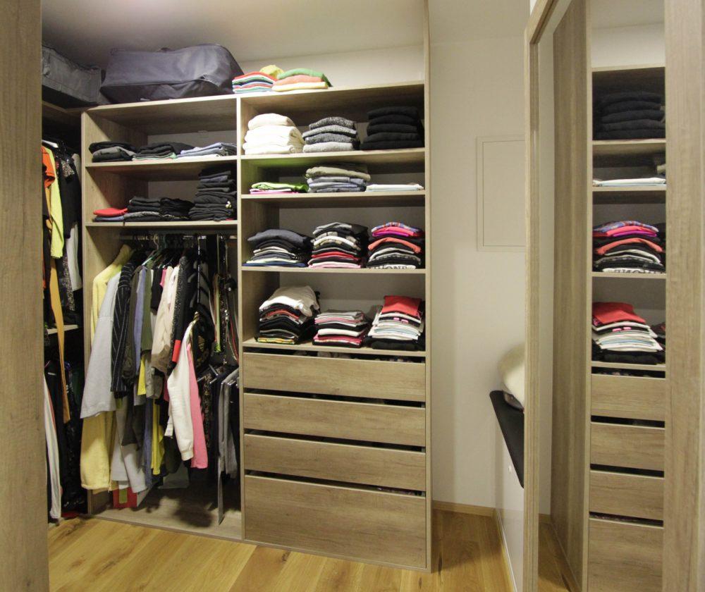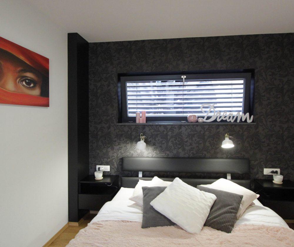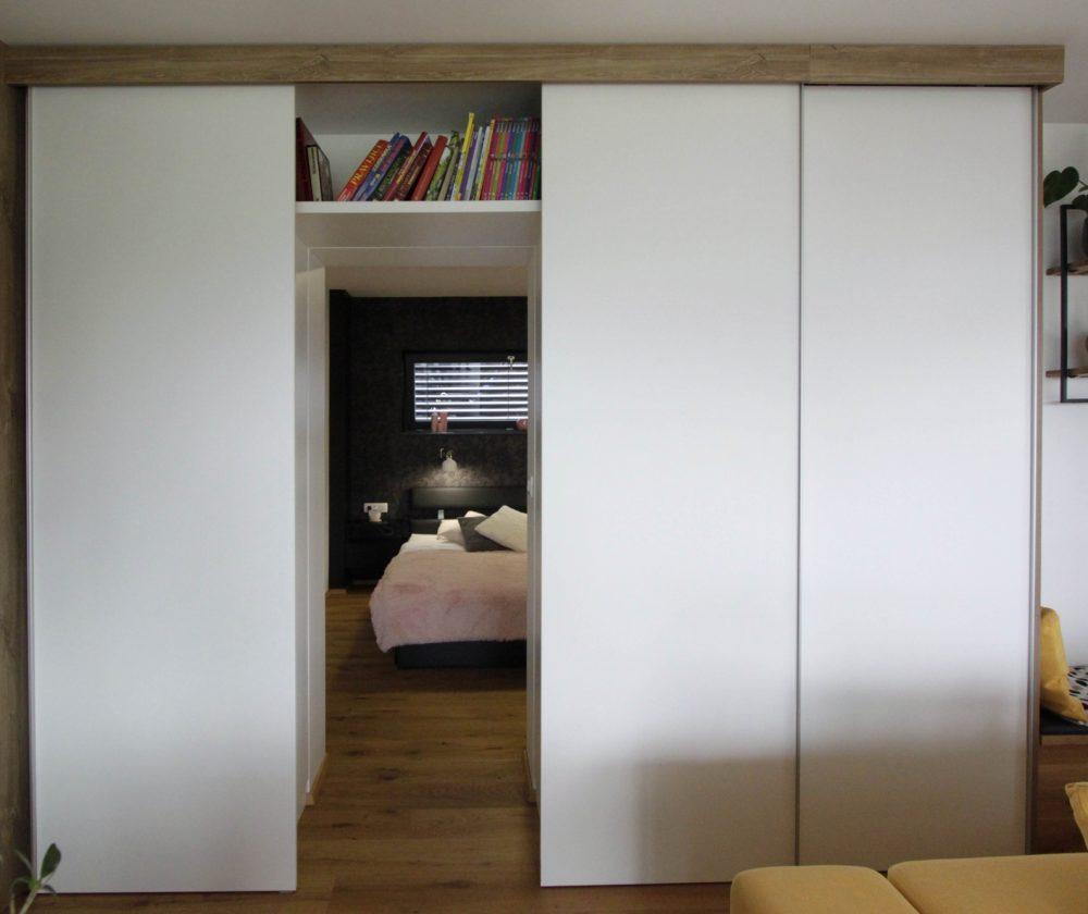 V spalnico zakoncev, ki je povezana še s kopalnico in garderobo, iz dnevne sobe ne vodijo klasična vrata, temveč se vanjo pride, presenetljivo, skozi omaro.