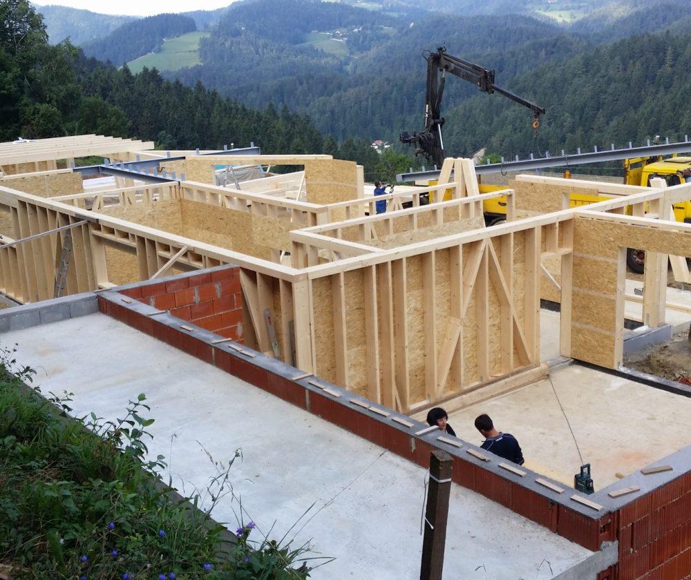 Družina Založnik se je odločila za leseno skeletno gradnjo, to je tradicionalni tip gradnje, v kakršnem se je gradilo na številnih območjih Slovenije še pred uveljavitvijo opeke in betona. V sami konstrukciji je okrog 70 kubičnih metrov lesa, v stene pa je kot izolacijski material vpihanih okoli osem ton celuloze, pridobljene iz zmletega starega časopisnega papirja. Suha gradnja je omogočila vselitev takoj zatem, ko je bila hiša dokončana.