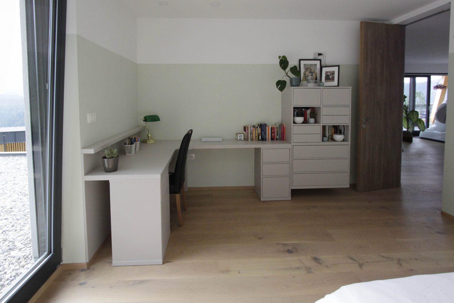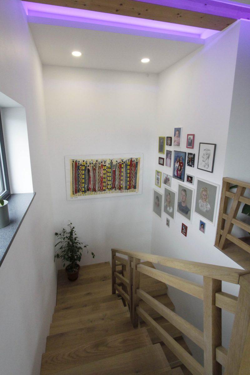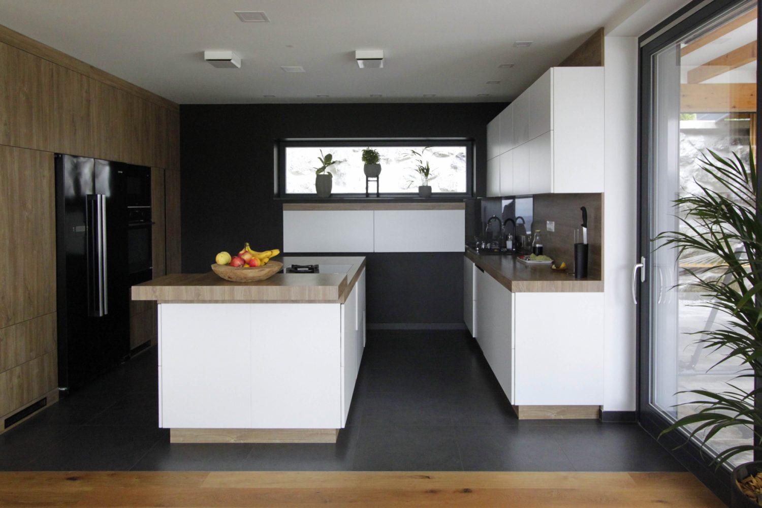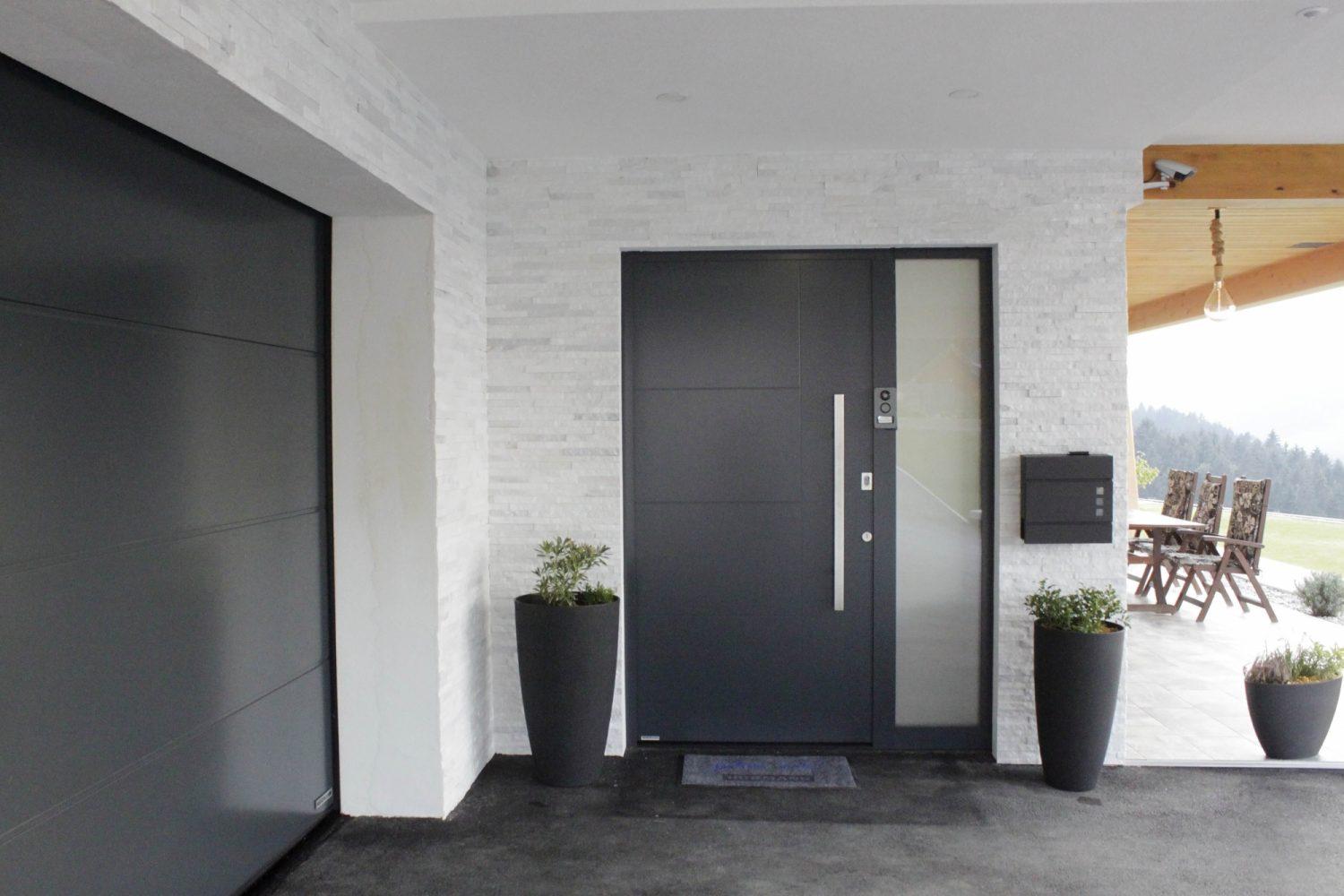 Čeprav je silno razgibana, hiša v Mislinji dosega pasivni razred energetske učinkovitosti. K temu pripomore tudi visokokakovostno stavbno pohištvo, ki ga opazimo že na daleč. Najprej nas pozdravi veličastni vhod, ki nadkrit s podaljšanim napuščem. Visoko izolativna aluminijasta vhodna vrata, ki sta jih lastnika podobno kot tudi garažna vrata izbrala pri podjetju Hörmann Slovenija, nudijo maksimalno varnost in udobje stanovalcem. Vgrajeno imajo večtočkovno zaklepanje, odklepajo pa se pomočjo prstnega odtisa. Za prijazen in svetel sprejem v predsobi poskrbi obsvetloba. So pa vhodna vrata barvno in stilno usklajena še z vrati na pomožnem objektu in garaži.