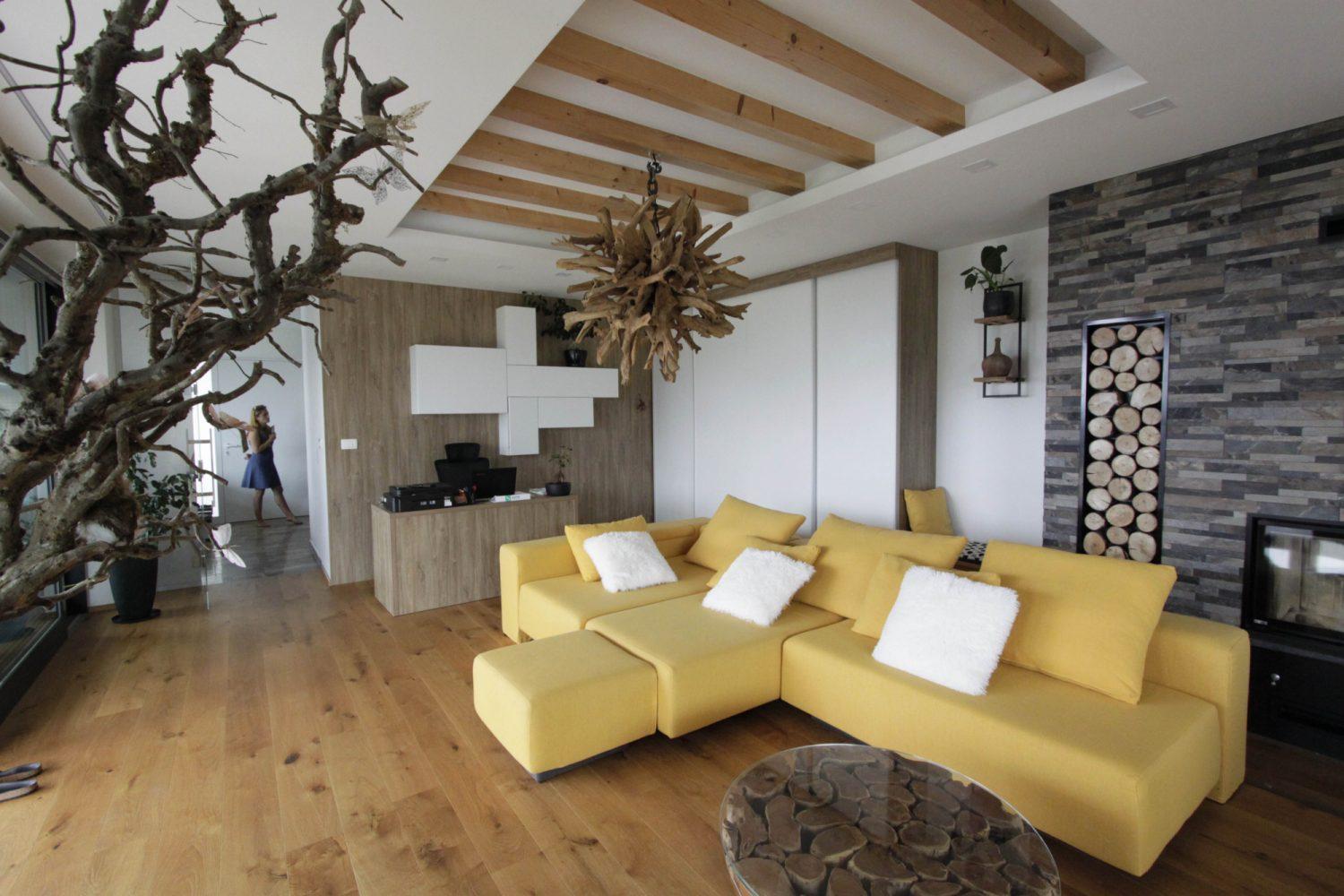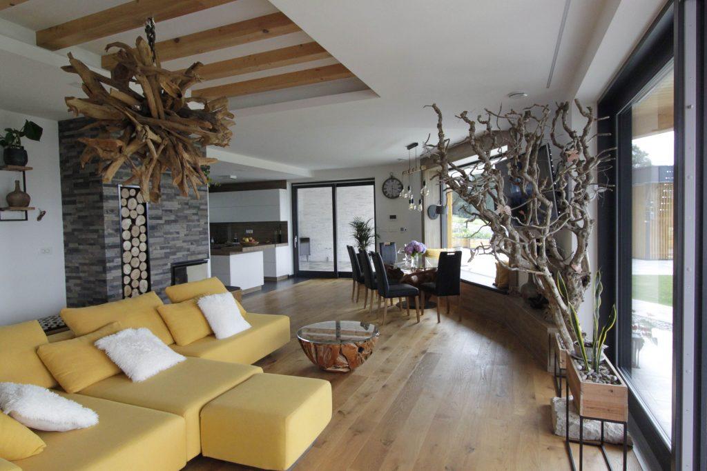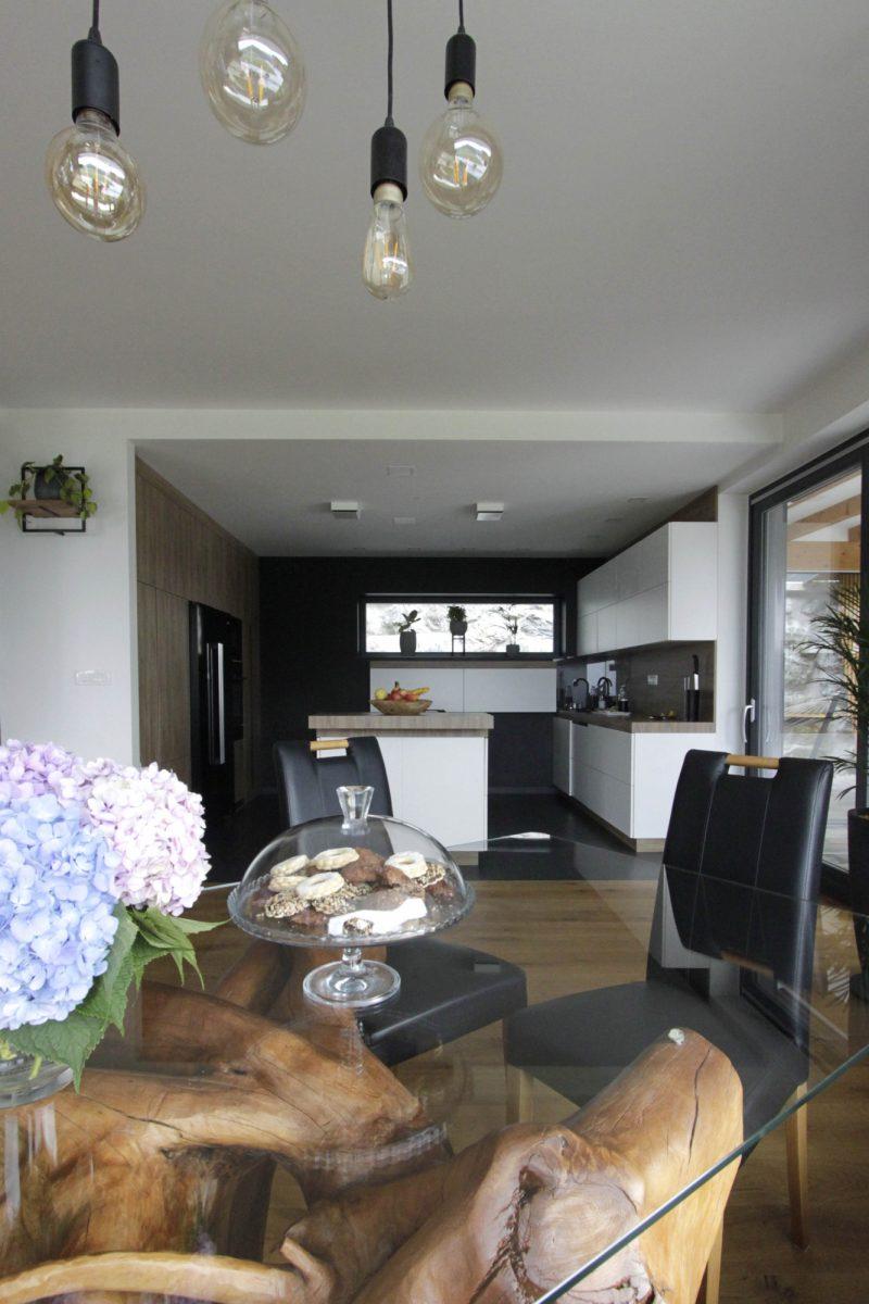 V spodnjem delu hiše iz velikega in svetlega predprostora vstopimo v bivalno-jedilni prostor, ki je fluidno povezan s kuhinjo. Osrednji del interjerja zaseda modularni kavč, ki žari kakor sonce in skladno dopolnjuje prostor, v katerem ima glavno besedo les. Ta se bohoti na tleh, lepota lesa je ujeta tudi v klubski mizici, jedilni mizi in unikatnem visečem svetilu, ki zapolnjuje tretjo dimenzijo.