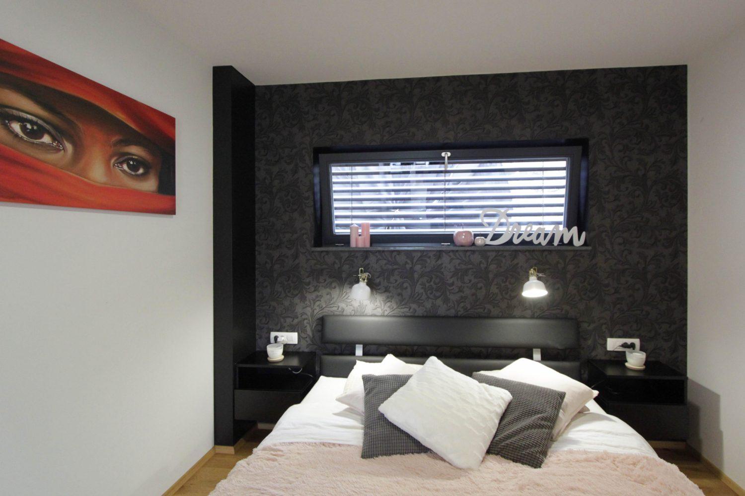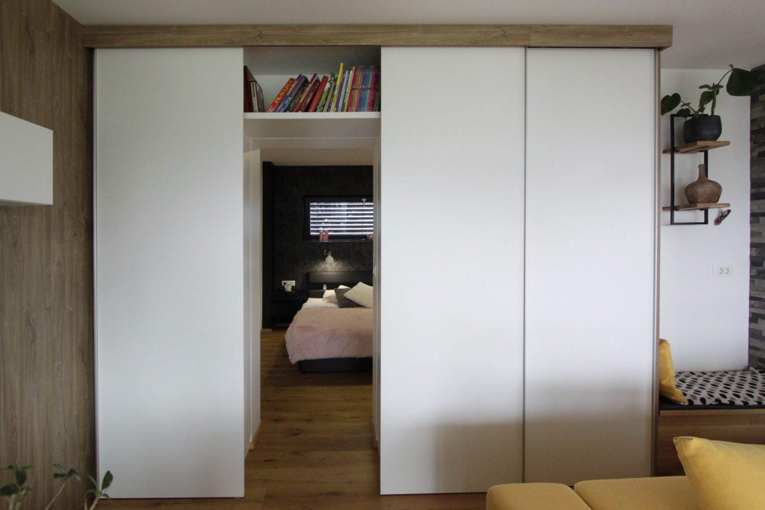 V spalnico zakoncev, ki je povezana še s kopalnico in garderobo, iz dnevne sobe ne vodijo klasična vrata, temveč se vanjo pride, presenetljivo, skozi omaro.
