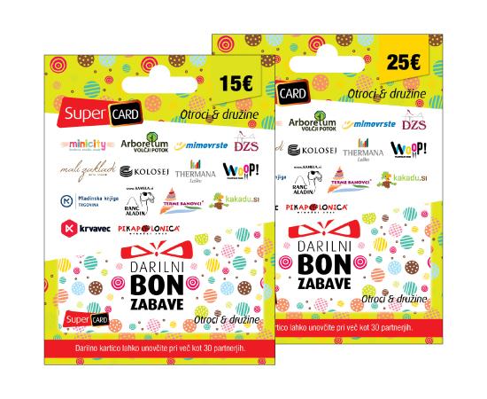 SuperCard kartica je darilo, ki se prilega vsakomur in je edina darilna kartica, ki jo lahko kupite preko spleta in jo koristite pri več kot 100 partnerskih trgovinah. Privoščite svojim najdražjim popolno darilo, ki ga lahko vnovčijo po lastnih željah. SuperCard kartice so na voljo v obliki zanimivih in tematskih voščilnic za različne priložnosti (božič, rojstni dan, poroka, rojstvo otroka ali kot zgolj pozornost za vam poseben in vesel dogodek) ter v obliki Darilnega bona želja. SuperCard kartice lahko kupite v različnih vrednostih, in sicer v vrednosti 15€, 25€, 50€ ter 100€.