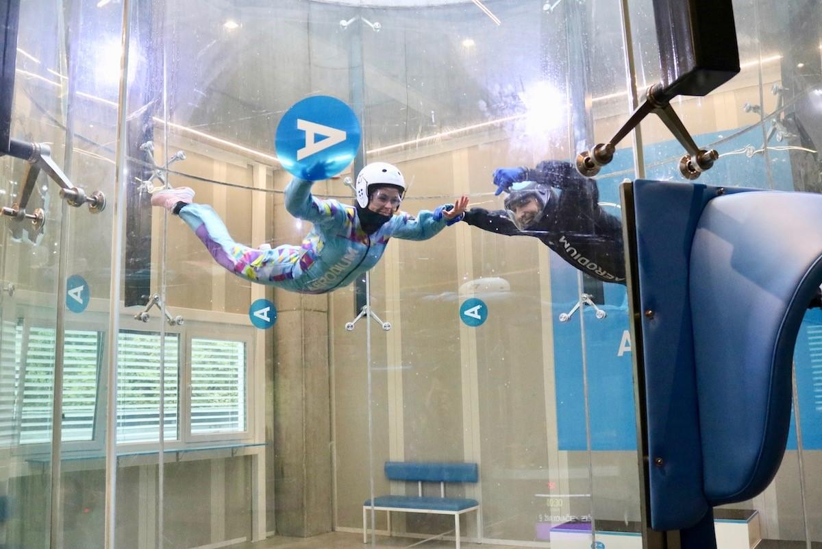 Vmes se vsake toliko srečam s steno vetrovnika, od katere se nežno in počasi odrinem, da me tok odnese nazaj na sredino vetrovnika. Inštruktor je ves čas z menoj, opazuje in mi pomaga, ko vidi, da sem »zaplavala« predaleč. Vmes se smeji in mi nakaže, da mi gre dobro, ter da naj se še sama nasmejim za fotografijo. Potem je čas za trik! Pokaže mi, kako naj obrnem roki, da bom začela krožiti. Roki premaknem in že se vrtim! Inštruktor me prime in me zavrti še močneje, nato pa me spusti, da me veter odvrti. Obrnem roki še v drugo smer in zavrtim se v obratni smeri urinega kazalca. Neverjetno, zgolj majhen premik rok, ki na »kopnem« ne povzroči nobene spremembe, v vetrovniku popolnoma spremeni tok gibanja!