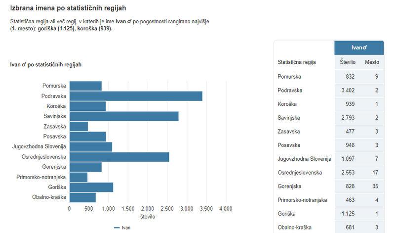 Marija in Ana ostajata prvo in drugo najpogostejše ime tudi v vsaki posamezni regiji. Franc je bilo najpogostejše moško ime v podravski, savinjski, zasavski in primorsko-notranjski regiji. Janez pa je bilo prvo po pogostnosti v osrednjeslovenski in gorenjski regiji. Izraz "kranjski Janez" tako še vedno velja. V obalno-kraški regiji je bil na prvem mestu Marko; Franc in Janez pa sta bili šele na 32. in 50. mestu. Ivan je bilo najpogostejše moško ime v koroški in goriški regiji, Jože v posavski in jugovzhodni Sloveniji, Jožef pa v pomurski.