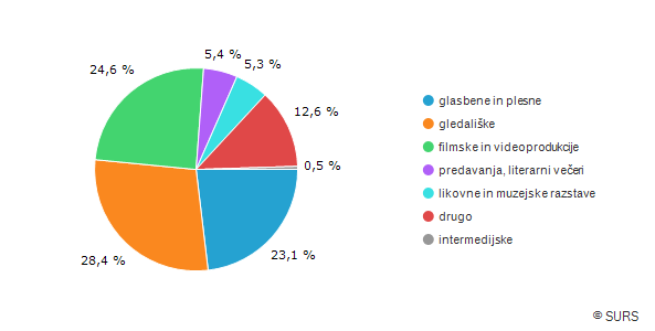 Med prireditvami je bilo največ (28,4 odstotkov) gledaliških predstav (kamor štejemo dramska in druga gledališka dela, lutkovne predstave in predstave eksperimentalnega gledališča), nato so sledile filmske in videoprodukcije (24,6 odstotkov), prireditve, povezane z glasbo (23,1 odstotkov - znotraj te skupine prireditev pa je bila na vrhu zborovska in vokalna glasba, sledili so simfonična in komorna glasba, folklorna dejavnost, sodobni ples, rock in urbana glasba itd.), predavanja in okrogle mize (5,4 odstotkov), likovne, muzejske ter druge razstave vizualne umetnosti (5,3 odstotkov).